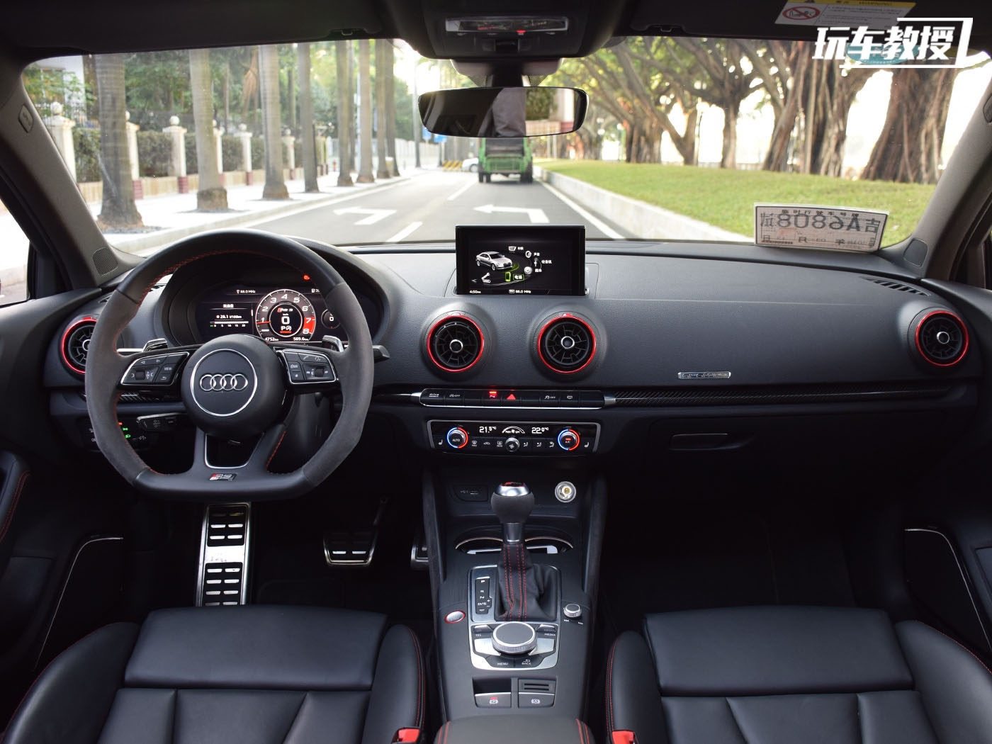 比外观更低调的还有RS 3的内饰,看着就和普通的A3没有区别,仅是全液晶仪表盘、中控台的碳纤维装饰条和运动风格的座椅,才能让你意识到这不是普通的A3,同时它的方向盘造型还与S3是一致的。