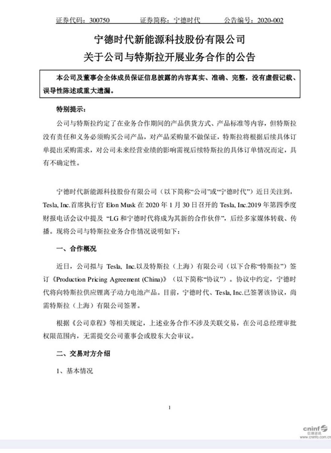 2月3日,宁德时代宣布与特斯拉开展业务合作,并公布了更多的细节。公告称,双方协议约定的供货期限为2020年7月1日至2022年6月30日。在此期限内,特斯拉将向宁德时代采购锂离子动力电池,具体的采购情况特斯拉会根据自身需求以订单方式确定,协议未对特斯拉的采购量进行强制约束,最终销售金额须以特斯拉发出的采购订单实际结算为准。受此利好,今日宁德时代股价一路飙升,最大涨幅一度超过8%,创下历史新高。