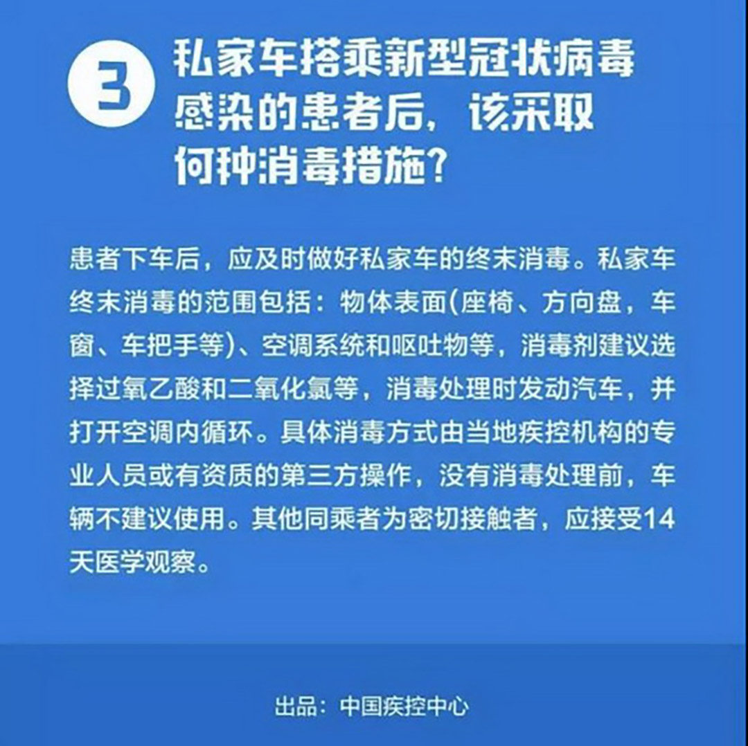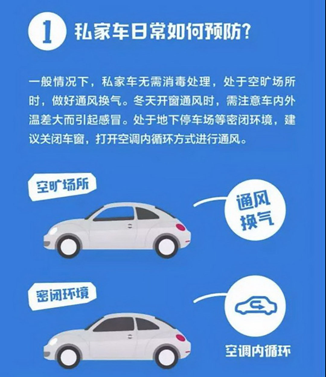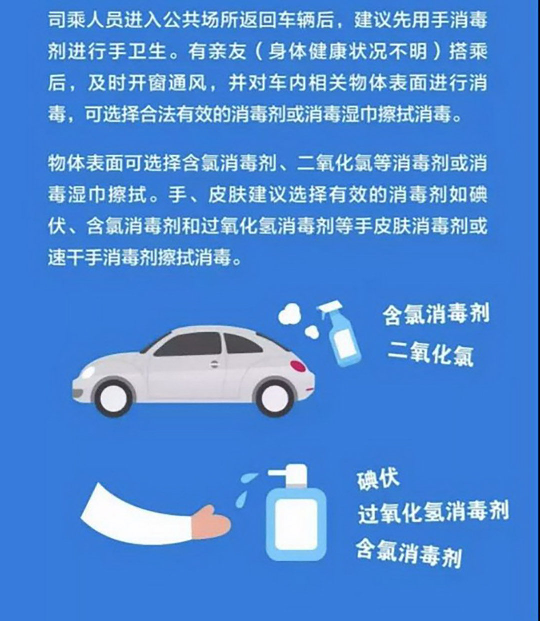 日前,中国疾控中心发布了关于新型冠状病毒感染的肺炎私家车预防临时指南。指南提示,车辆在空旷场所需保持通风换气,在密闭环境里应当开启空调内循环。另外,车主可通过含氯消毒剂和过氧化氢消毒剂等进行手、皮肤的消毒。当车内搭乘可疑人员时,应当开窗通风并保持一定距离,待可疑人员下车后,对其车门把手、车窗、座椅等进行消毒。具体指南请查看下方图片。