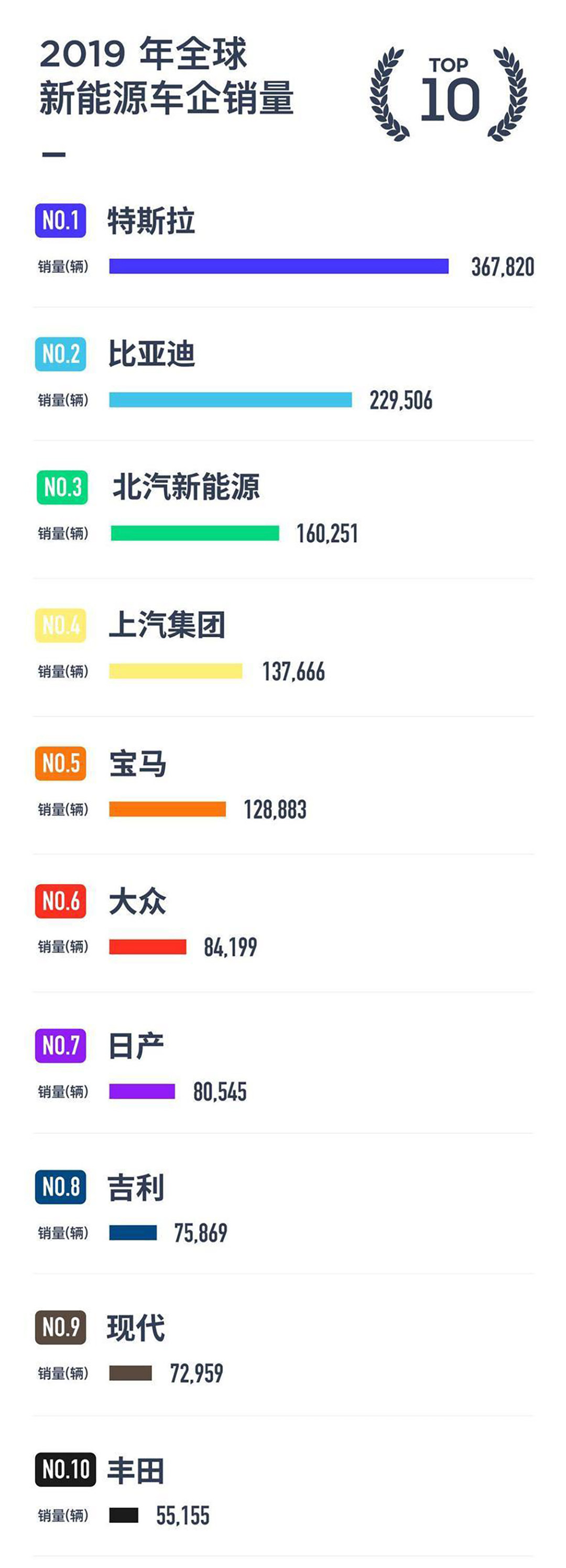 根据报表显示,2019年,特斯拉以 36.7 万辆击败比亚迪,成为排名排在首位的新能源厂家。而比亚迪、北汽新能源、上汽集团则分别以 22.9 万辆、16.02 万辆和13.7 万辆排在第二、第三和第四名。