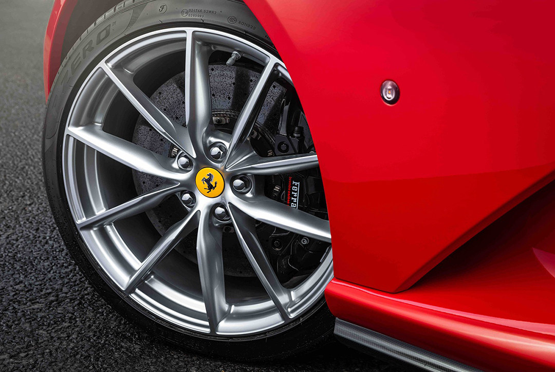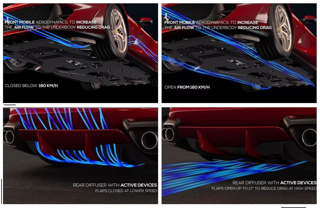 除了可见的表面,在平常看不见的车底也下了功夫,812 GTS的多层尾部扩散器设置有可以翻转17°的翼片,而位于前轮处的主动翼片又可以旋转14°,这样可以利用底部气流,低速时为刹车盘散热,高速时让气流快速通过,增强下压力,这一切都是为了让812 GTS快一点,再快一点…