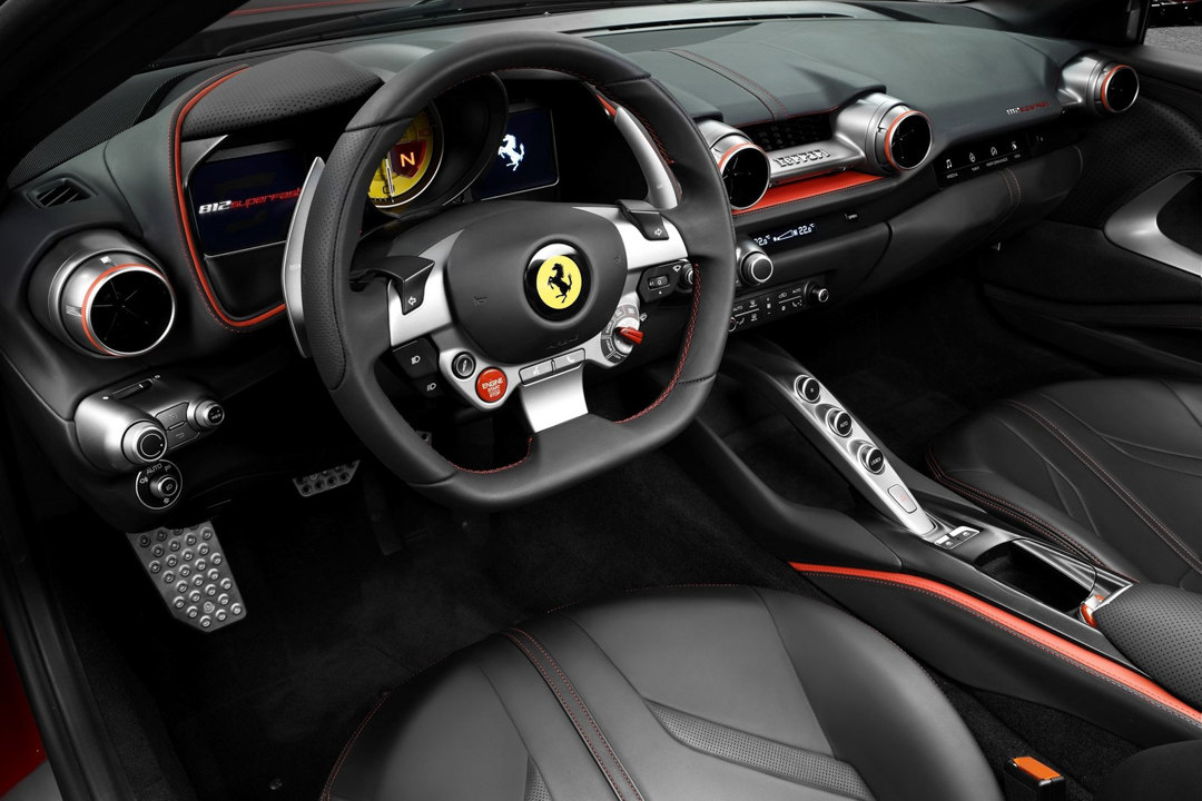 为了容得下硕大的V12发动机,812的发动机舱必须足够修长,由此也带来了极具美感的车身比例。所看到的每一条曲线,除了增添风骚之外,都有提升空气动力性能的作用。硬顶敞篷在车速低于45km/h状态下,可以在14秒内升起或闭合。在晴朗的天气下,你肯定会非常愿意开启敞篷,法拉利特意在前风挡处设置了L形塑胶条,别小看了这个设计,它可以让你的头部风感更舒适。