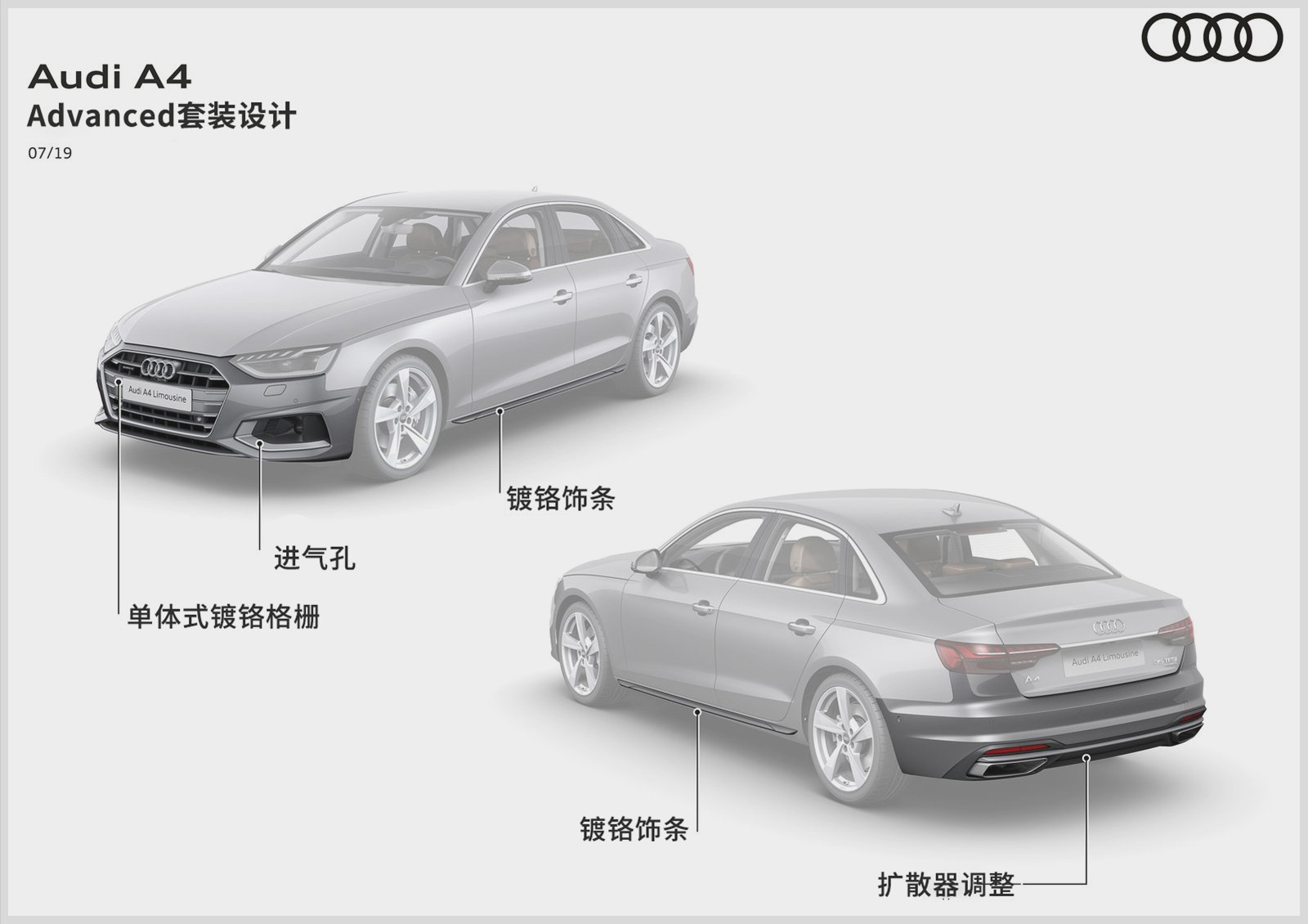 有人看了海外的中期改款A4觉得跟现款差不多,实际上,奥迪对A4L在外形上的改动其实还真不小,海外车型会有运动S-line和标准Advanced版两套外观设计,对格栅、前后包围进行了设计上的优化,跟随新世代A6/A7/A8的设计语言,而且现如今BBA三家品牌的中型车都不约而同地走上运动化路线。