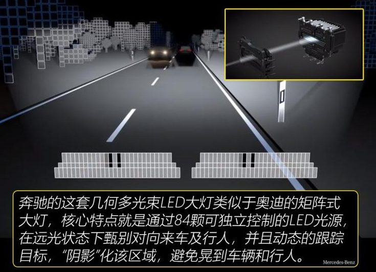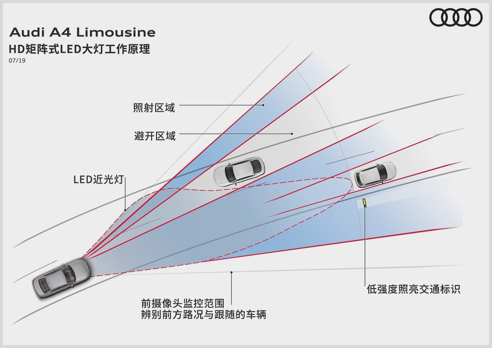 在马路上行驶的时候,搭载矩阵式LED灯之后,车辆会通过内后视镜上方的摄像头探测前方的车辆和交通标志,如果遇到车辆,则会通过光束调节机构控制大灯的照射范围,避免强光照射对向车辆酿成危险;照射路牌的时候,通过64级亮度调节,降低照射亮度则可以降低路牌造车强烈的反光,让驾驶者获得一个良好的视线,提高安全系数。