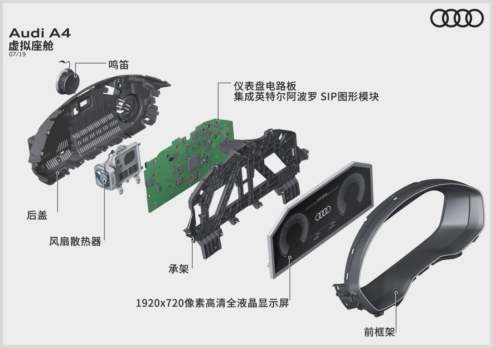 我们由近及远,先从距离驾驶员最近的【虚拟座舱】说起,硬件部分由:图形模块、显示屏、框架和其他零部件组成。重点在于两个部分,图形模块从原来的英伟达替换为英特尔阿波罗的模组,处理信息能力更快;而显示屏采用1920*720高分辨率液晶显示屏,现款的是1440*540的分辨率,而尺寸没有改变,依然是12.3英寸。