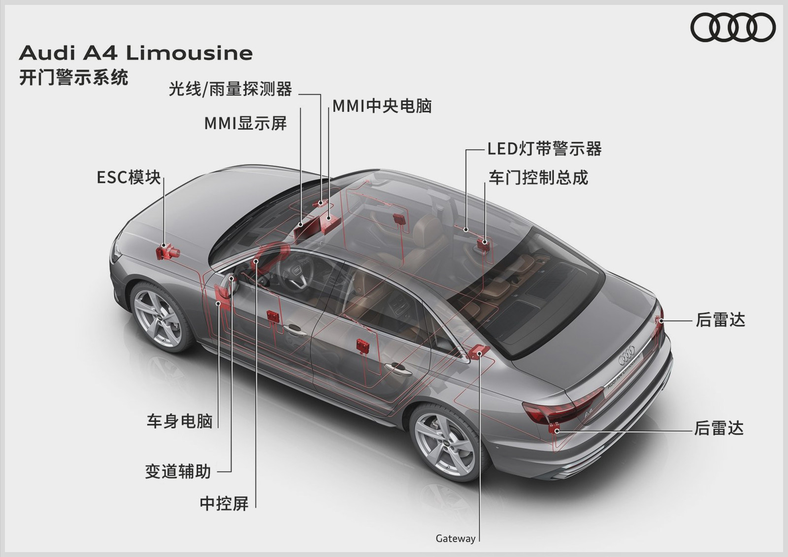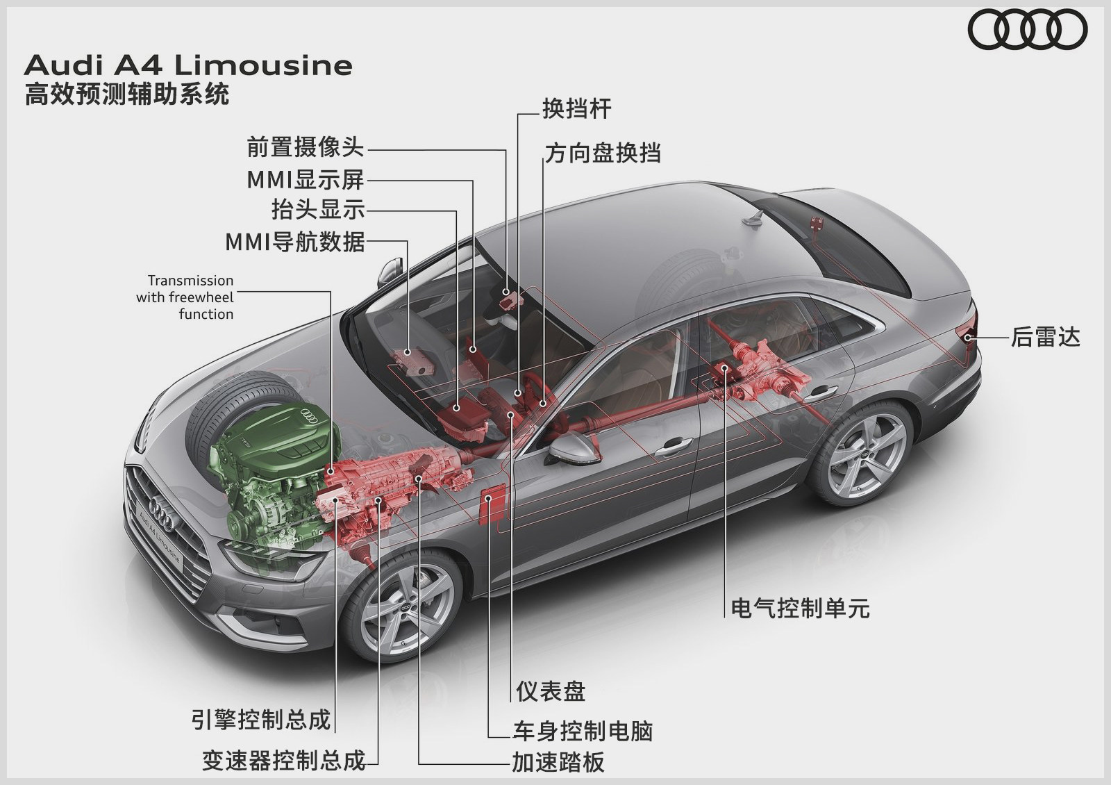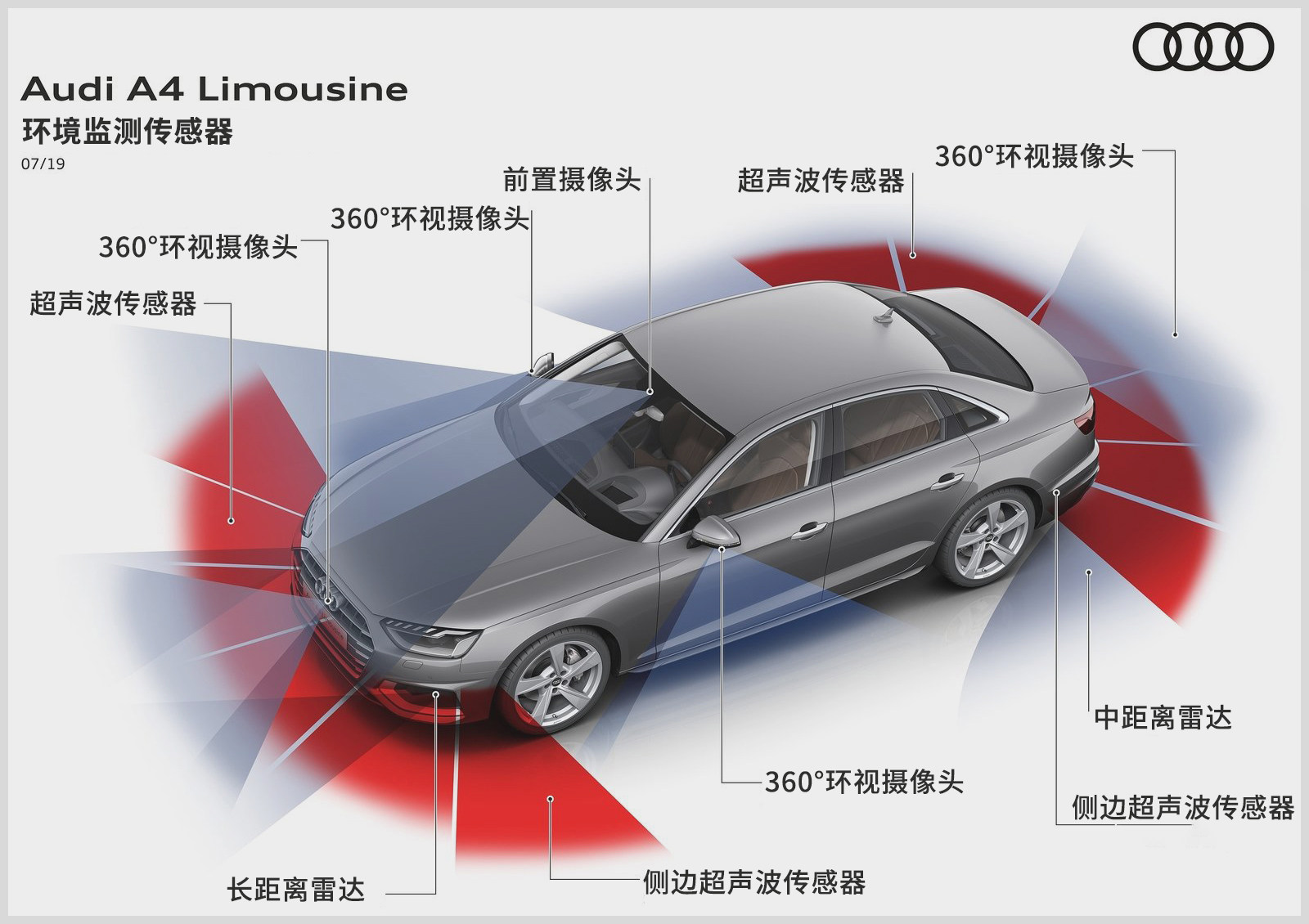 辅助驾驶功能的硬件方面,A4的环境探测硬件主要依靠4个摄像头组成的360°环视影像、前/后/侧方的超声波雷达、长距离/中距离雷达、还有内后视镜上方的前置摄像头。