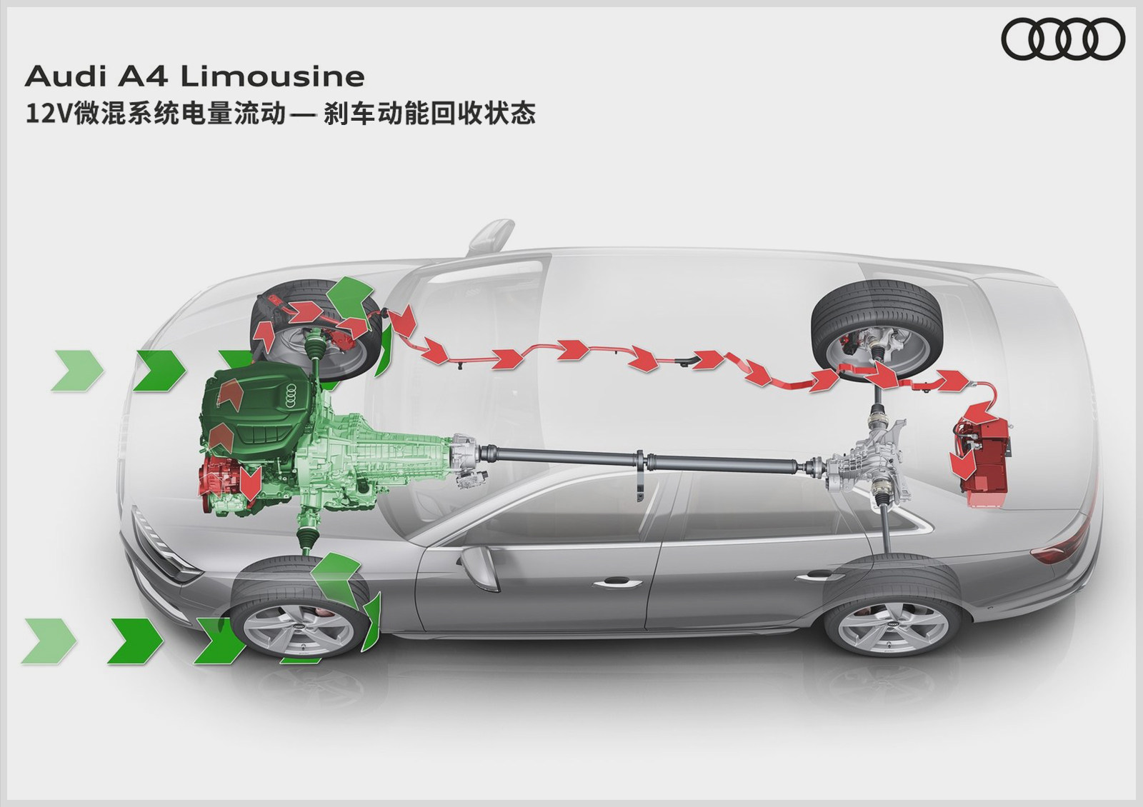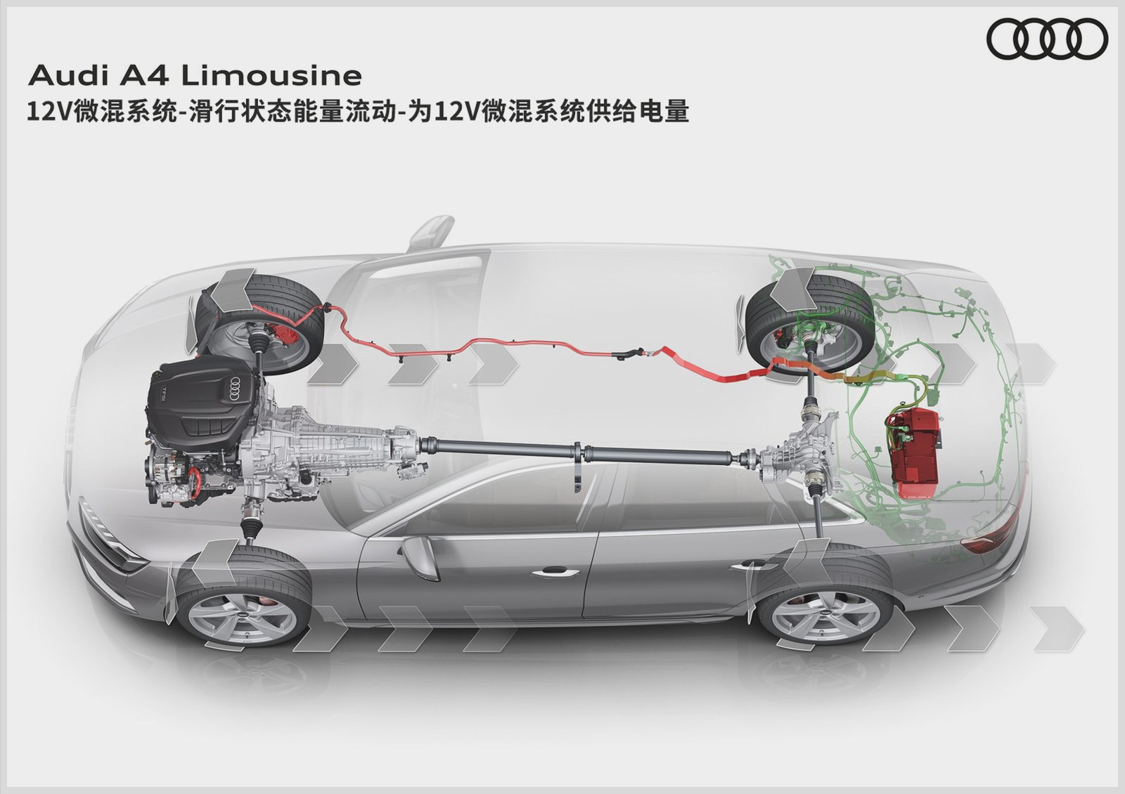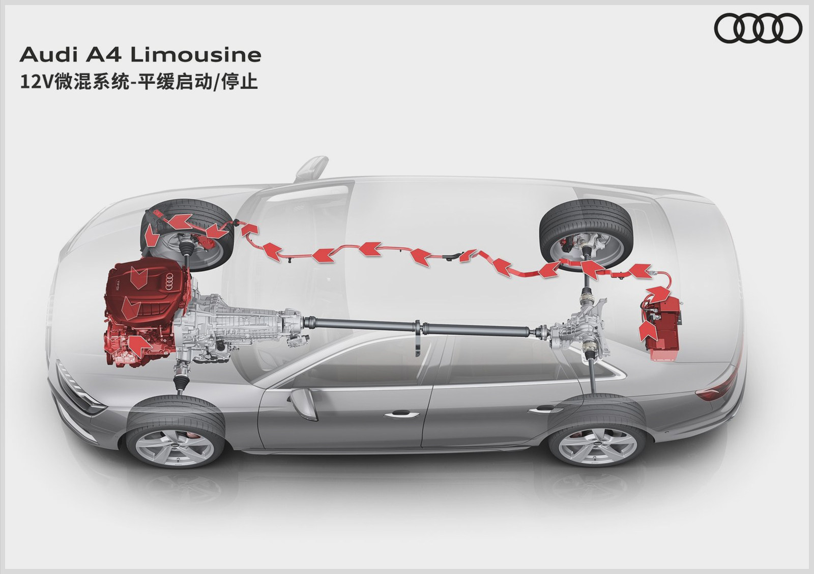 值得讨论的点是奥迪全新的12V微混系统——Mild-Hybrid 12 Volt-Antriebsstrang,硬件上的主要组成部分是12V电池组、启动电机。这12V微混是个“似旧而新”的系统,众所周知,国内比较多的是48V轻混,而且以前也有12V,但不叫“微混”,而叫“电源”,那奥迪的这个12V轻混又有什么不同?