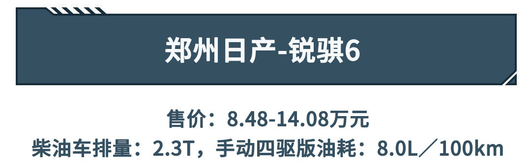 2020款锐骐6柴油版搭载了与海外版纳瓦拉同款M9T 2.3T发动机,满足国六排放,发动机最大功率为163马力,最大扭矩为380牛·米,满足国六标准。与发动机匹配6MT变速箱,据悉未来还将有ZF 8AT变速箱,另外四驱系统车型配备有伊顿差速锁,有利于脱困。根据车主反馈,手动四驱柴油版的油耗约为8.0L/100km。
