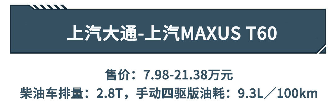 上汽MAXUS T60柴油版搭载了2.8T发动机,发动机最大功率为150马力,最大扭矩360牛·米,与发动机匹配6MT或6AT变速箱,是目前市面上为数不多的几个匹配6AT变速箱的皮卡之一。因为发动机排量摆在那里,所以它的油耗也是这次推荐的几款车型中最大的,根据车主反馈,手动挡四驱版的油耗约 9.3L/100km。