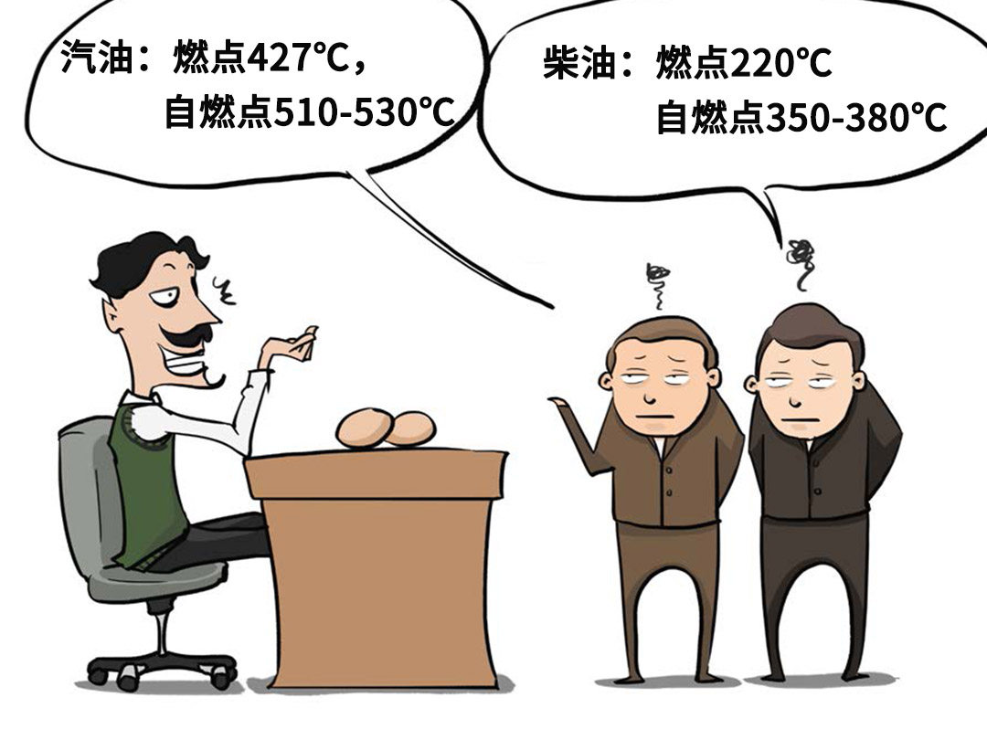 相比汽油,柴油的燃点和自燃点要低不少,两种燃料燃点的不同导致了汽油机和柴油机点火方式的不同。汽油机因为燃点高需要借助火花塞点火;而柴油因为燃点低,通过压缩缸内空气升温(对空气做功,空气温度上升),就能够点燃柴油,称之为压燃式点火。