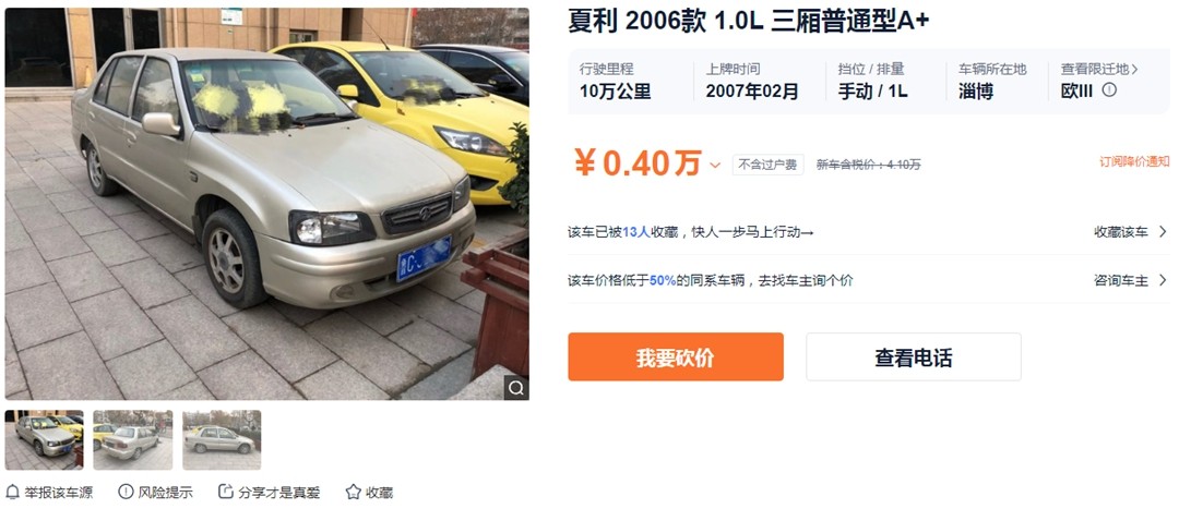 而如今,第一代夏利上市已经时隔30多年,二手车市场已经见不到这样的古董车型。目前二手车市场最便宜的夏利为2006款三厢普通型,采用的也是当下流行的三缸发动机,而售价仅需4000元,相当于一个月的工资买一辆车。