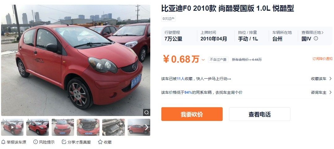 如今时隔10年时间,二手车市场上很多比亚迪F0的价格,已经跌入10000元以内。其中最低的报价是2010款比亚迪F0,售价仅需6800元。相对于其他几千元的车,比亚迪F0由于新车售价低,因此如今买到的车龄并不算太长。