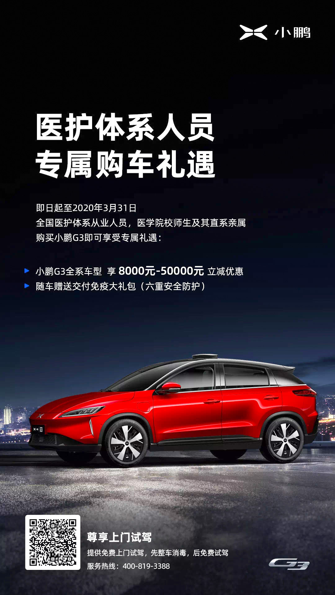 其次,为感恩医护体系人员的辛勤付出,小鹏G3推出针对医护体系人员的专属购车礼遇,全国医护体系从业人员、医学院校师生及其直系亲属购买G3均可享受8000-50000元购车优惠以及交付免疫大礼包等专属待遇。