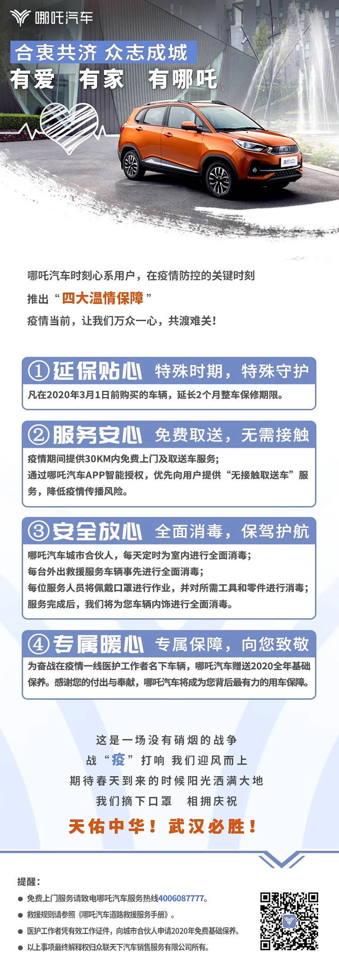 每台外出救援服务车辆实现进行全面消毒;每位服务人员将佩戴口罩进行作业,并对所需工具和零件进行消毒;服务完成后,我们将为您车辆内饰进行全面消毒。为奋战在疫情一线医护工作者名下车辆,哪吒汽车赠送2020年全年基础保养。