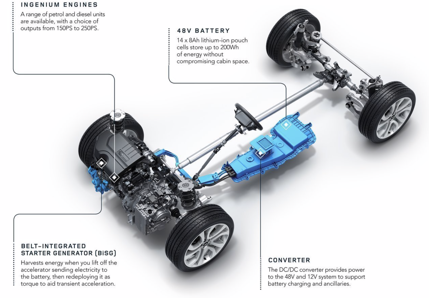 新款车型在采用了Ingenium 2.0升涡轮增压发动机+48V轻混系统并搭配9AT变速箱的全新动力总成。新车依然提供高/低功率可选择,低功率版本最大输出功率为200马力,峰值扭矩320牛·米,高功率版本最大输出功率为249马力,峰值扭矩365牛·米。