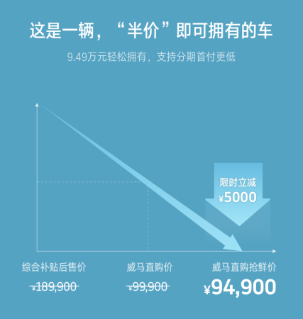 2020年1月16日,威马汽车发布“威马直购”新零售模式。用户仅需支付9.49万元就能“半价”拥有综合补贴后售价18.99万元的威马EX6 Plus 400轻享版车型,以最划算的方式轻松拥有B级智能纯电动SUV。
