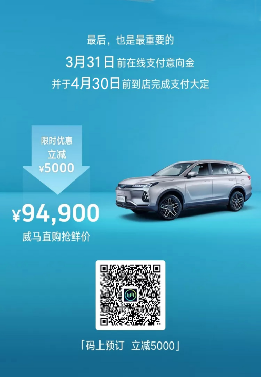 “威马直购”新零售模式,能够大幅降低用户的拥车门槛。消费者只需在3月31日前完成666元意向金支付,并于4月30日前支付10,000元购车定金,便可获得购车尾款立减5000元及价值1000元的一年车机免费4G流量使用礼遇。仅需支付9.49万元,就能“半价”拥有综合补贴后售价18.99万元的威马EX6 Plus 400轻享版车型,以最划算的方式轻松拥有B级智能纯电动SUV,让智能新能源汽车生活触手可及。