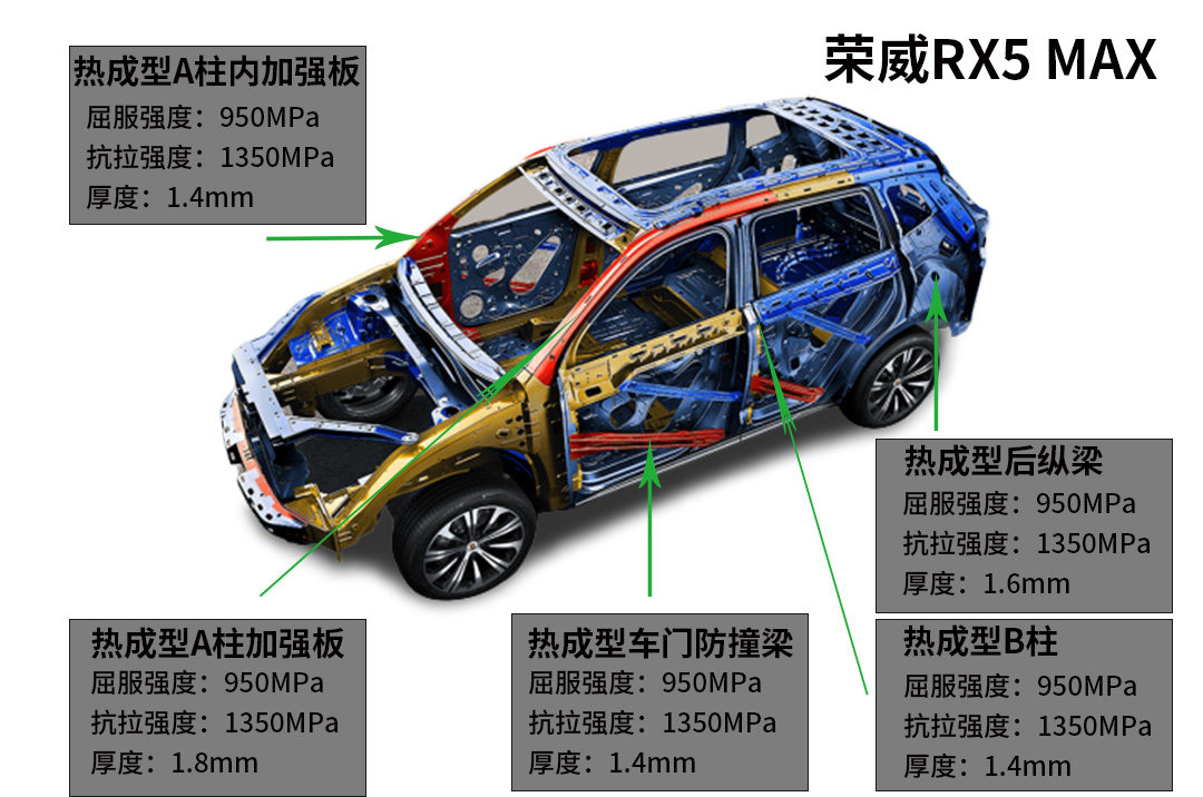 以前面说的荣威RX5 MAX为例,ABC柱都由950Mpa屈服强度的热成型钢组成,A柱内还有热成型加强板,前排车型还有热成型防撞梁。笼式车身结构本身就安全,这款车的用料也很厚道,前防撞梁吸能盒体积大,吸能效果是以往的4倍。