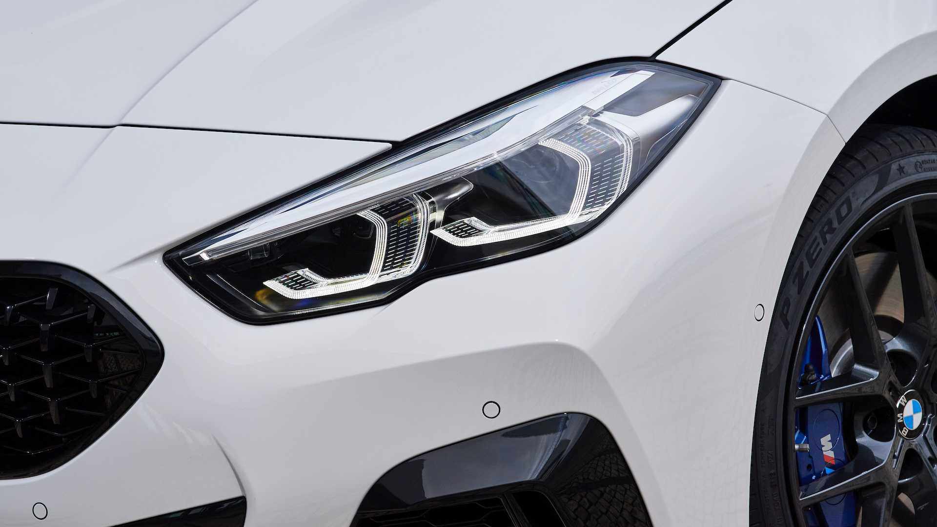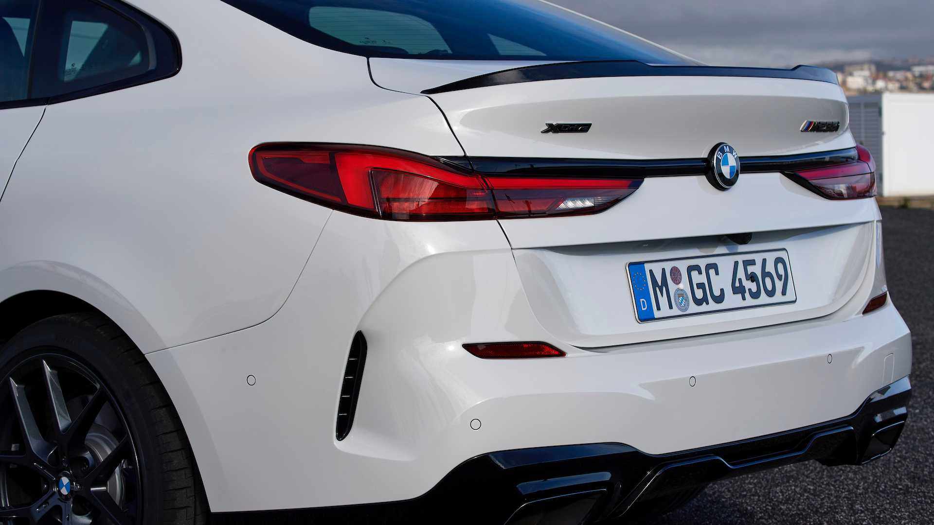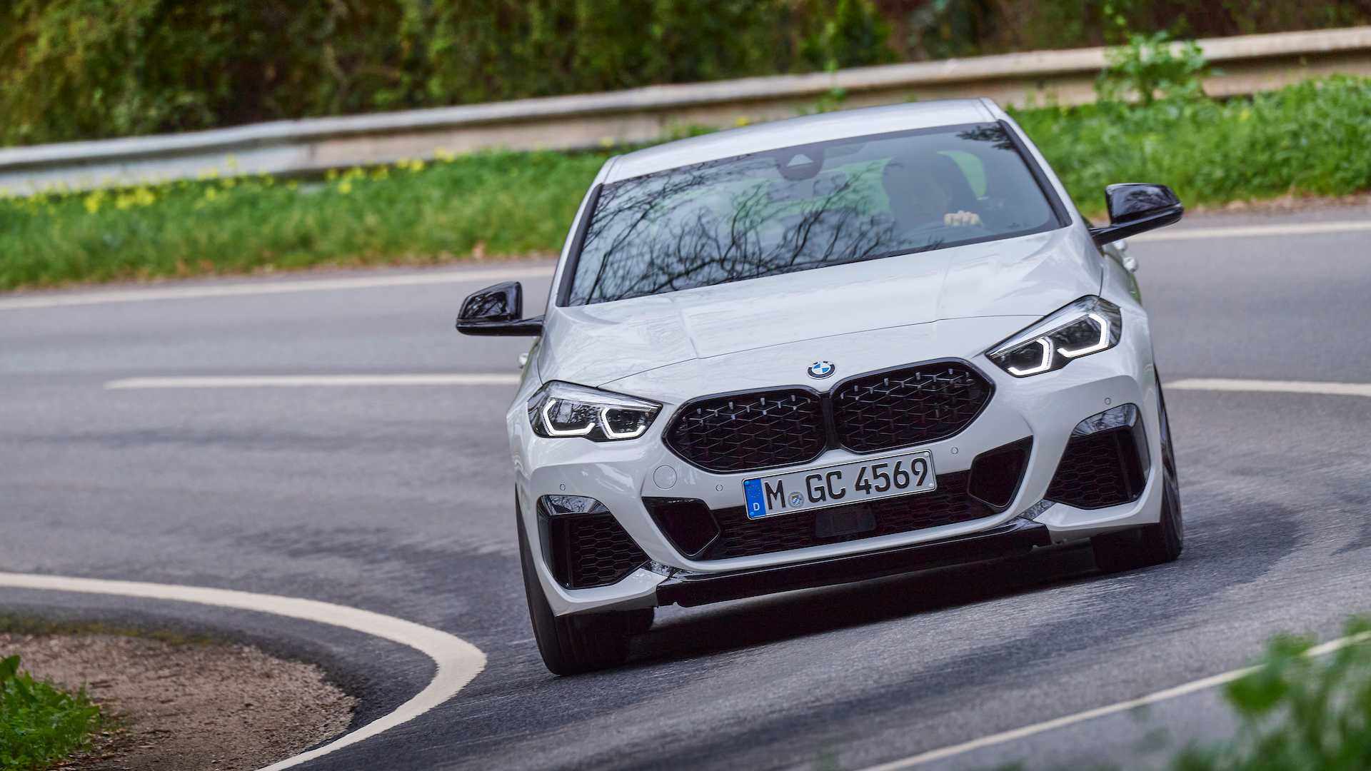 2系GC的车头外观与两厢版本的1系非常相似,其外观设计风格我们都已经非常熟悉了,得益于上挑的前大灯以及面积不小的前进气格栅,整个车头的视觉感受非常饱满。外媒试驾编辑试驾的M235i车型,由于搭配了M套件让原本已经非常有力量感的车头还带有一点攻击性的意味,十分凌厉。