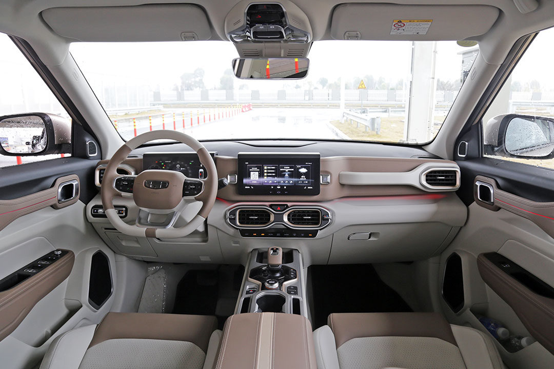 进入车内,吉利ICON那种惊艳的感觉甚至要比外观来得更加强烈一下,双色的搭配结合各种高低不同的曲面造型,以一个装饰条作底,仪表盘、中控屏和副驾驶扶手以不同形式附着在上面,能够给人带来年轻、精致、时尚的冲击感,在设计感的营造方面比较到位,辅以高档的皮质包裹,使得整个车内带有一点格调。