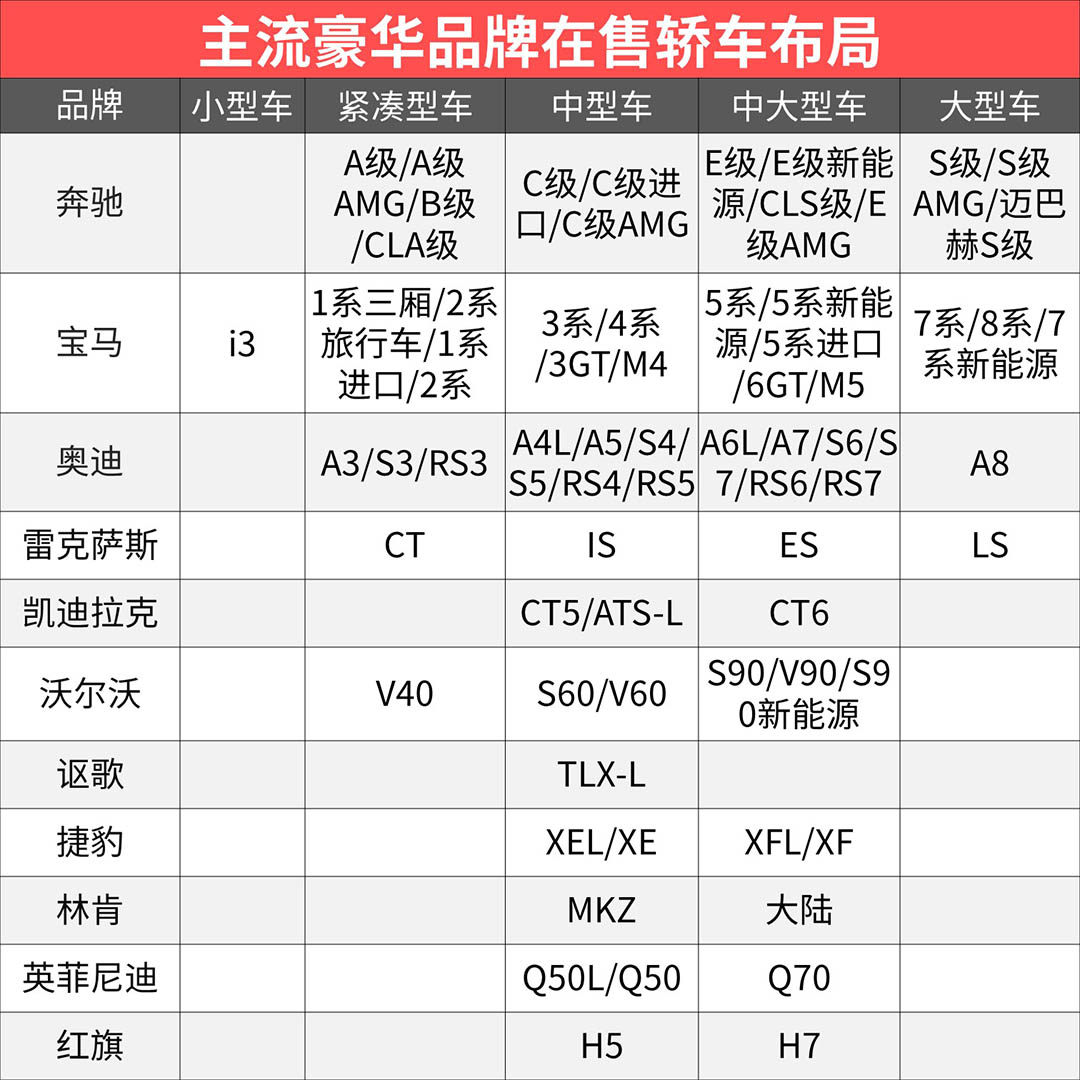在BBA的产品序列中,紧凑型车型很多,比如说奔驰的A级两厢/A级三厢/CLA和B级,宝马的1系三厢/1系两厢/2系旅行车等,乍一看BBA很热衷于做紧凑型轿车,其实不然,它们在产品数量上相比较其它豪车本身也具有碾压优势,在中型和中大型车市场,它们往往都布局了超过2款以上的产品。从小型车到大型车都有在售车型,广泛布局产品是一个汽车品牌必然的趋势,紧凑型车只不过是它们规划中的一部分。