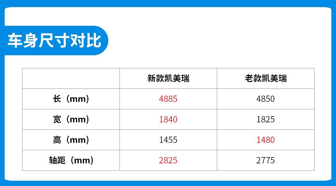 相比老款凯美瑞,新款车型在车身长度和宽度上都有所增加,轴距也增加到2825mm。车身尺寸的加大和售价的降低,让新款凯美瑞大受欢迎,再加上TNGA架构的加持,整车的行驶质感相比老款车型提升不少;并且采用了全新的设计,前脸更加犀利,整体造型年轻、运动,老少皆宜;另外内饰的设计也更具质感,配置在同级车型中也处于领先地位。