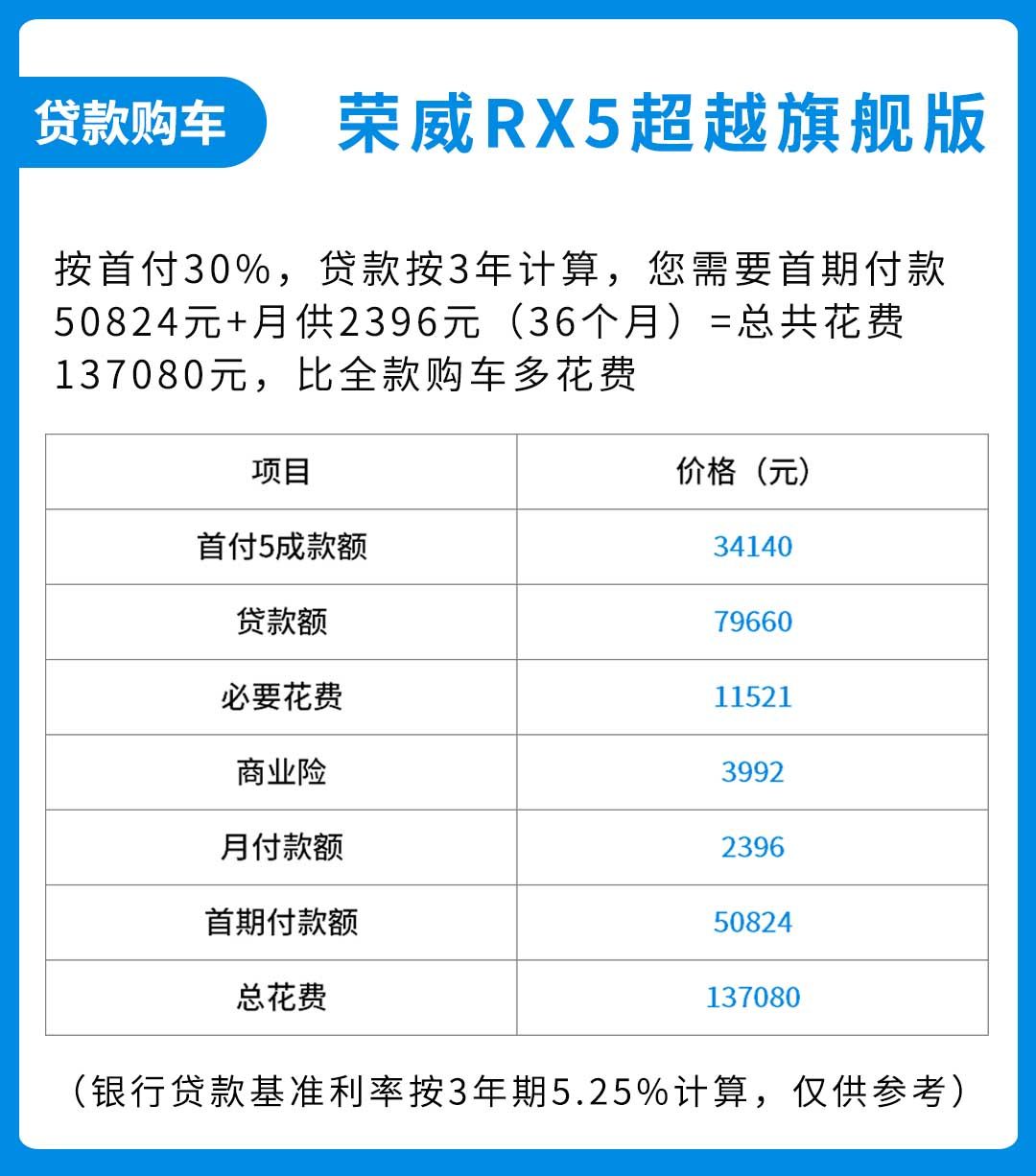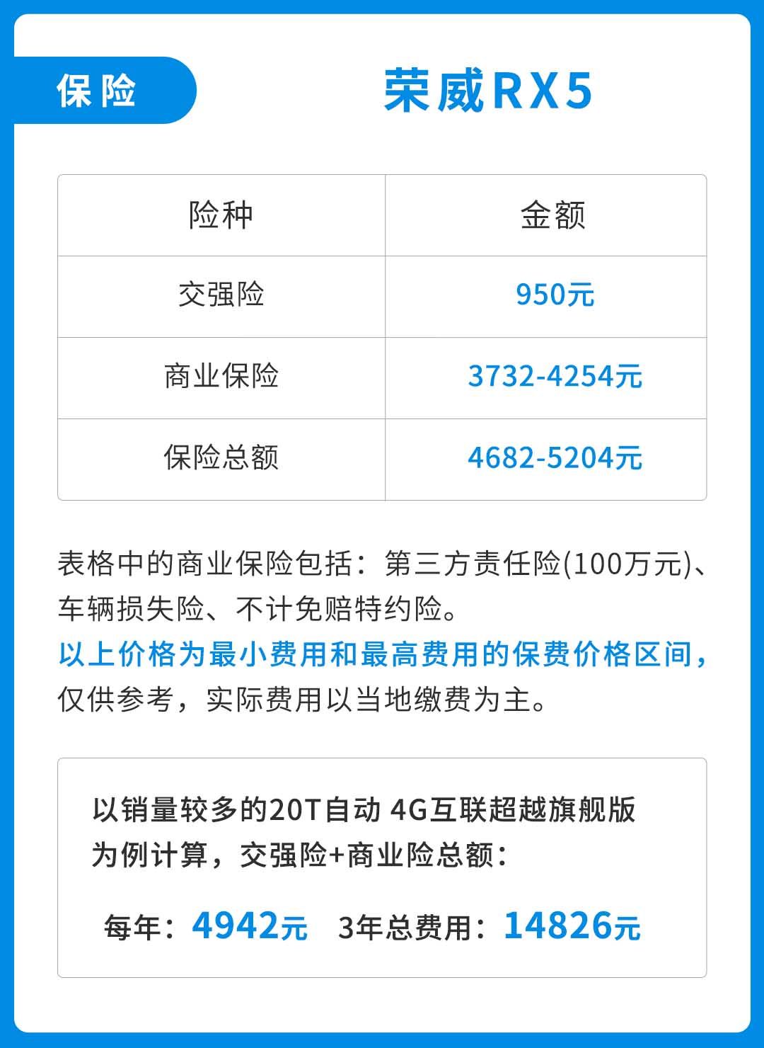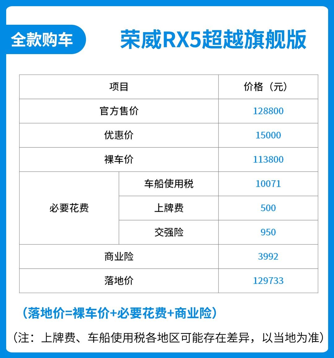 在全款购车的情况下,荣威RX5超越旗舰版的最终落地价为129733元。(注:保险包括交强险和商业险,其中商业险包括第三方责任险(100万)、车损险、不计免赔特约险)