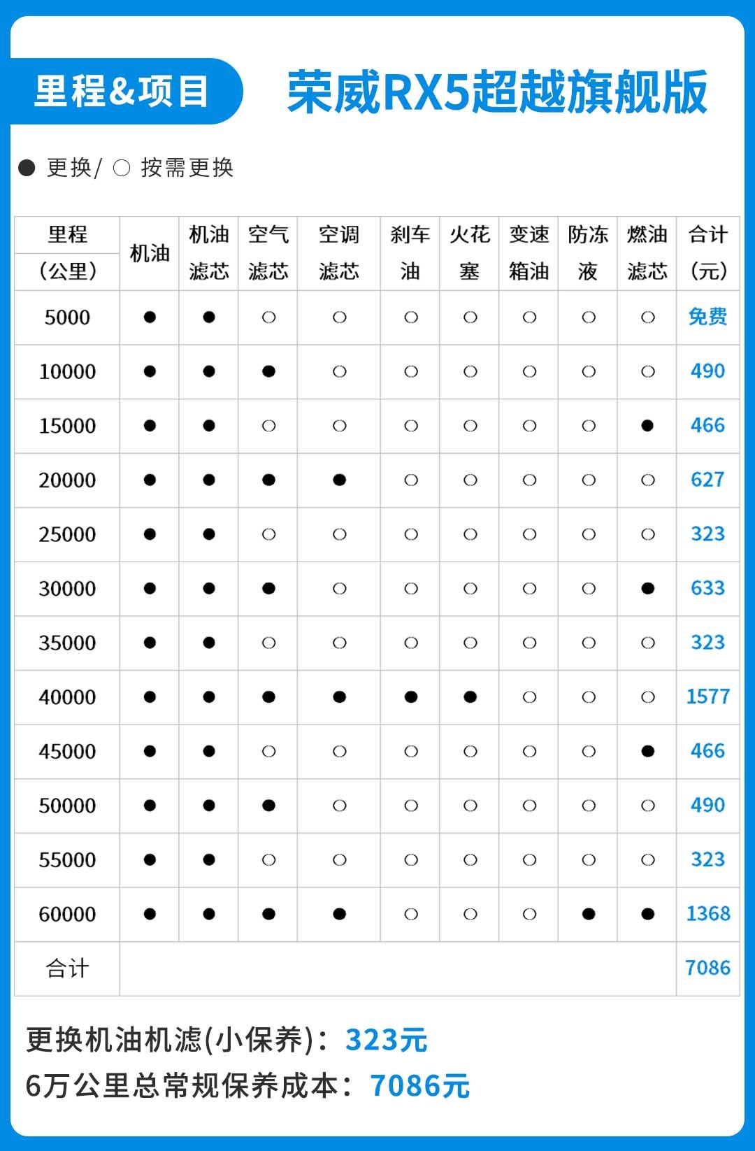 计算得出,荣威RX5超越旗舰版3年的保养总花费为7086元,每年平均花费2362元,每月平均花费196元。