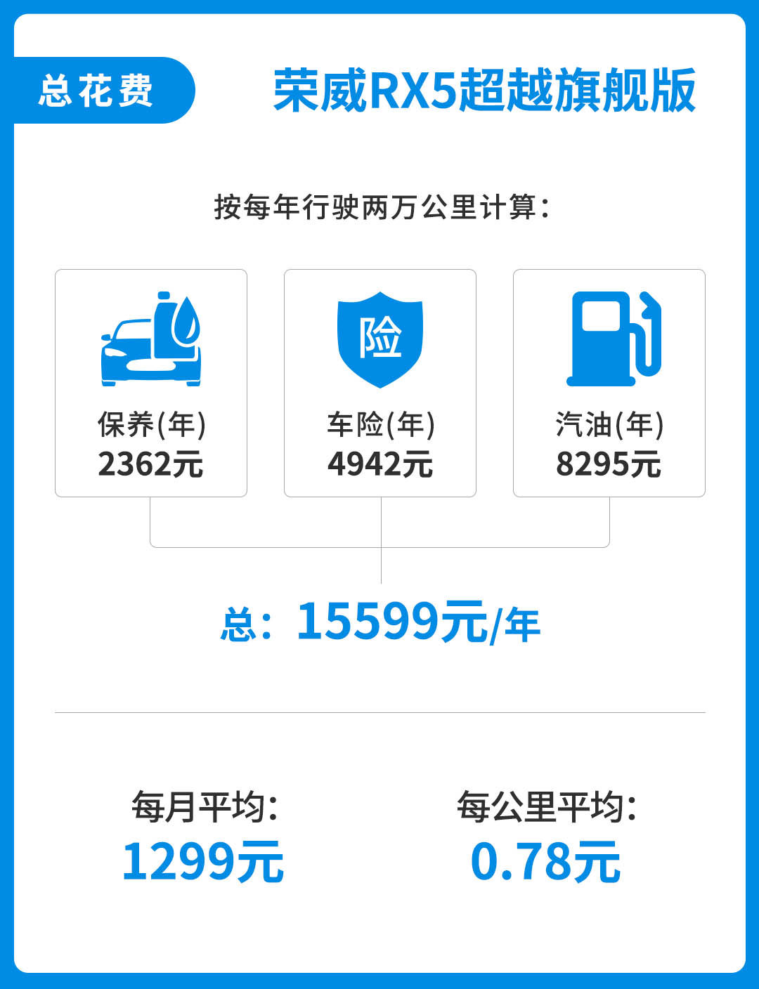 通过计算,我们得出荣威RX5每月的基本养车费用约1299元,对于一款紧凑型SUV来说,这样的费用并不算高,根据我们之前的计算,普通合资紧凑型SUV的基本养车费用一般在1400元左右,所以在养车费用方面,荣威RX5还是有一定优势。