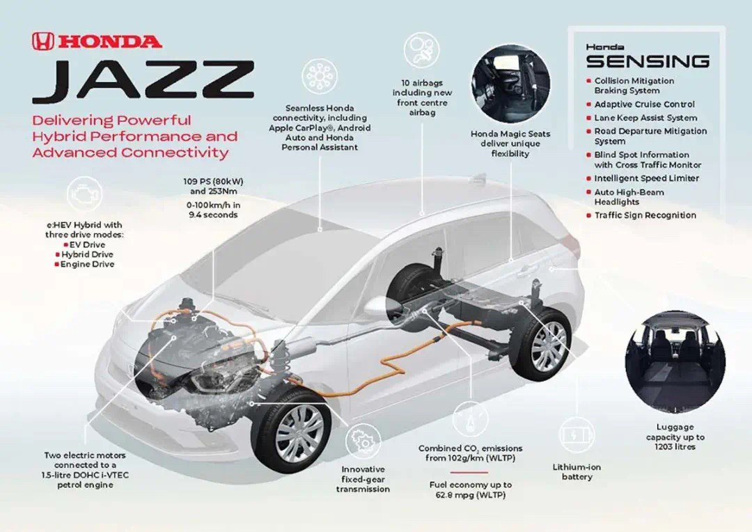 e:Hev是本田最新研发的油电混动系统,该系统由1.5L自然吸气发动机和双电机组成。根据此前新飞度的曝光信息,其发动机最大功率为98马力,峰值扭矩127牛·米;电动机最大功率为109马力,峰值扭矩253牛·米,与之匹配e-CVT变速箱。