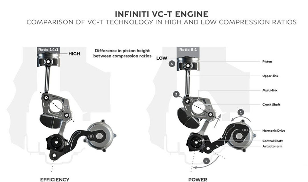 这就是日产集团的VC-TURBO可变压缩比涡轮增压技术,通过复杂的连杆设计调节活塞高度,从而改变引擎压缩比,例如,在追求经济性的工况下,引擎最高压缩比可达14:1,以提高燃油燃烧效率,而在追求动力工况下,压缩比可降至8:1以避免爆燃影响动力输出。
