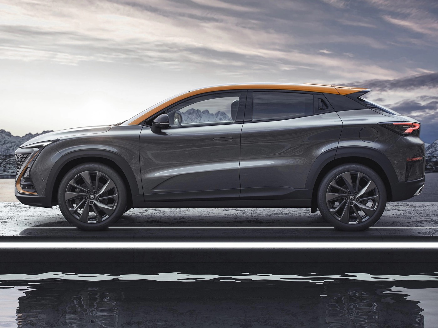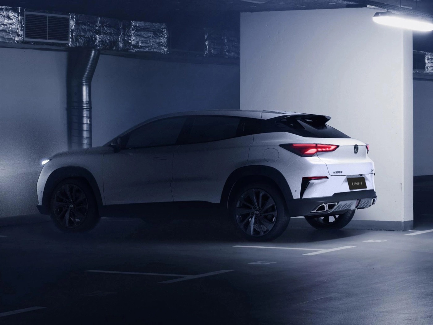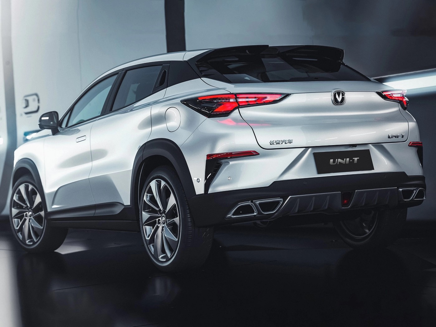 侧面来看,UNI-T的造型低矮,其B/C柱熏黑的设计营造出悬浮式车顶的感觉,而车窗线条呈上扬趋势。另外新车将会提供多种车身双配色选择,轮毂方面将会提供19寸五辐式和20寸十辐式轮圈。