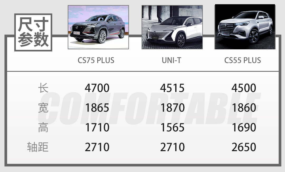 UNI-T将地位紧凑型SUV,其车身尺寸和轴距处于另外两款长安紧凑型车之间,分别是CS75 PLUS和CS55 PLUS,不过新车轴距与CS75 PLUS保持一致。