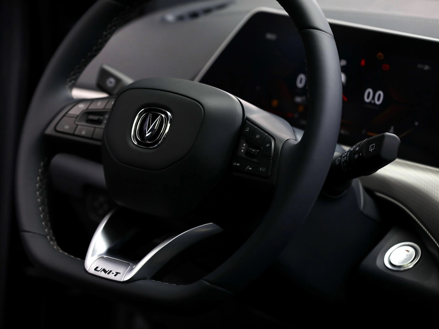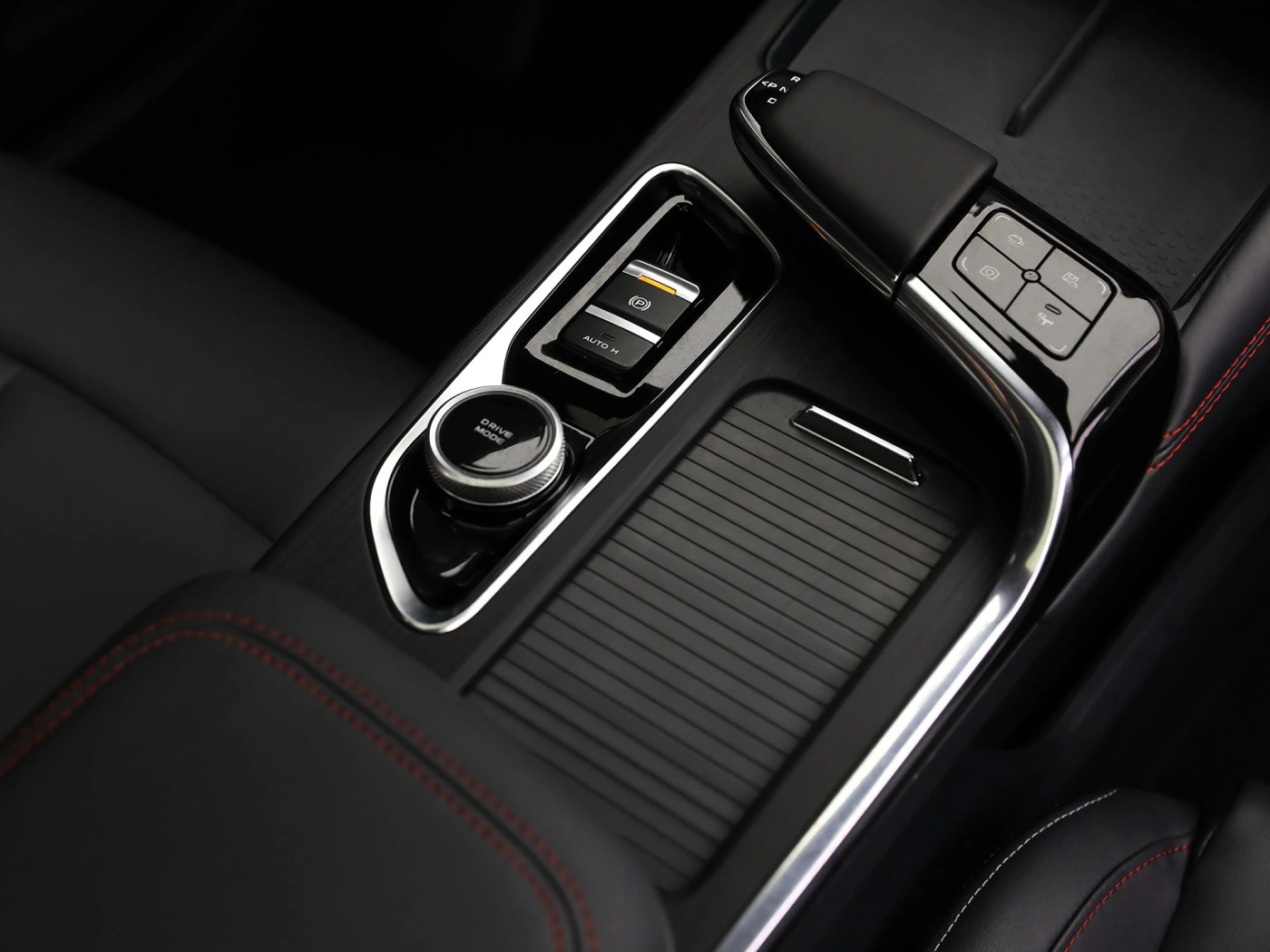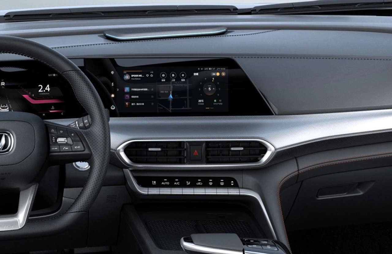 最大的变化是换挡机构,它采用了当下较为流行的悬浮式档把,换档机构处于左侧,预计是通过前后推动来完成档位选择;而右方为按键区域,提供拍照、录像和自动泊车等功能。