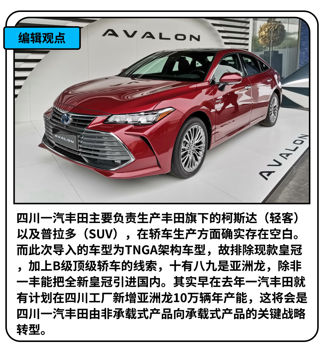 此前,四川一汽丰田新车型项目在成都经济开发区正式启动。新车型为四川一汽丰田导入丰田公司TNGA技术平台的B级顶级轿车,总投资约33亿元,计划于2021年投产,年产目标10万辆。四川一汽丰田称,新车型的导入,也填补了成都造汽车在B级乘用车领域的空白。