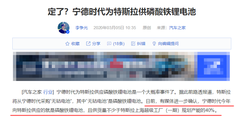 根据前不久路透社的报道,特斯拉将从宁德时代采购“无钴电池”,日前有媒体进一步确认,宁德时代供向特斯拉的就是磷酸铁锂电池,且供应量不小于特斯拉上海超级工厂(一期)规划产能的40%。