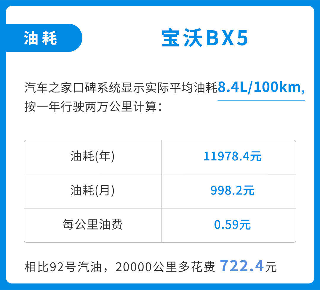 以宝沃BX5和smart fortwo的油费来看,一年下来所多出的油费其实并不高,与其担心燃油标号带来的高油费,其实还不如担心油耗所带来的差价。
