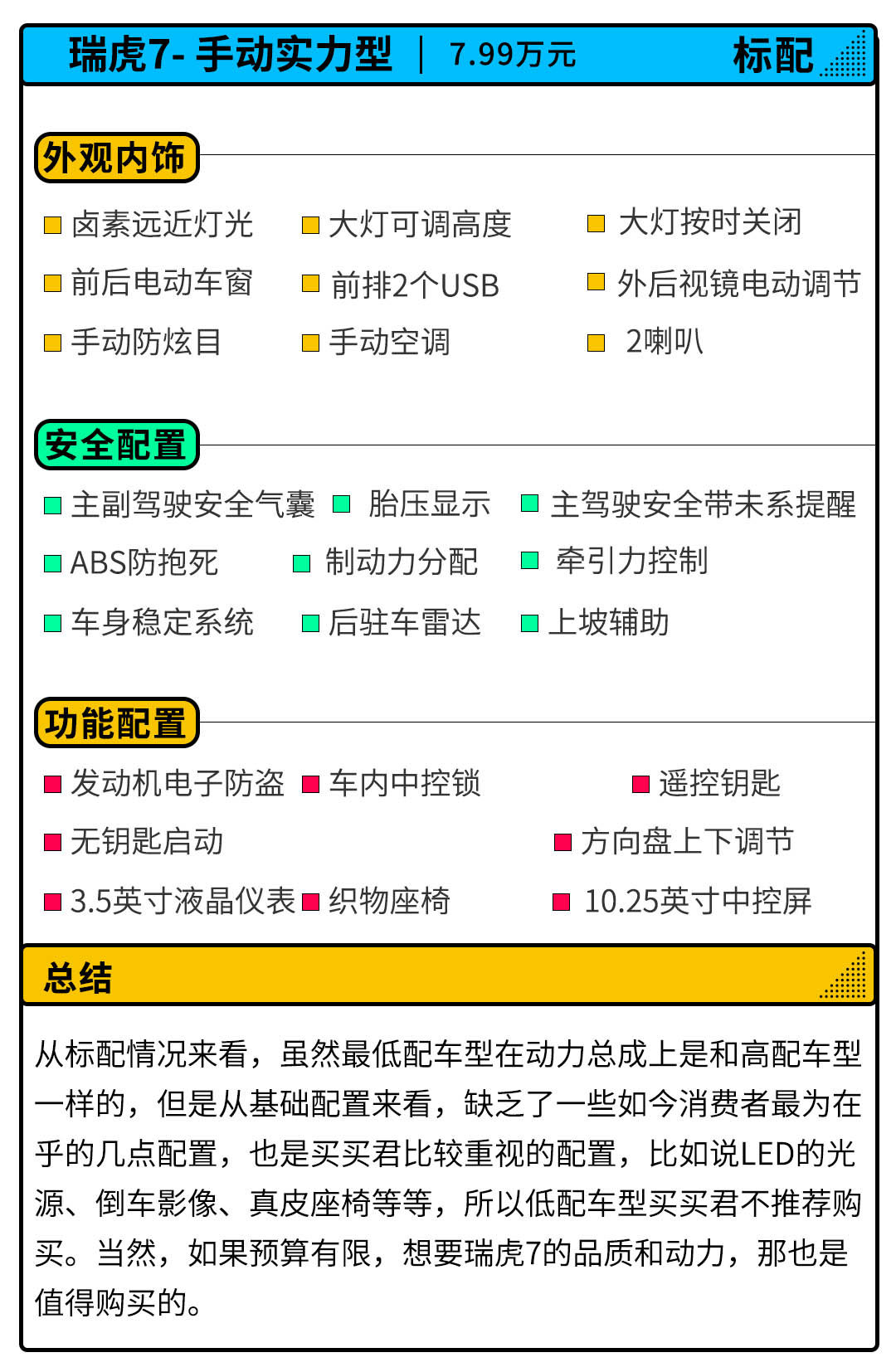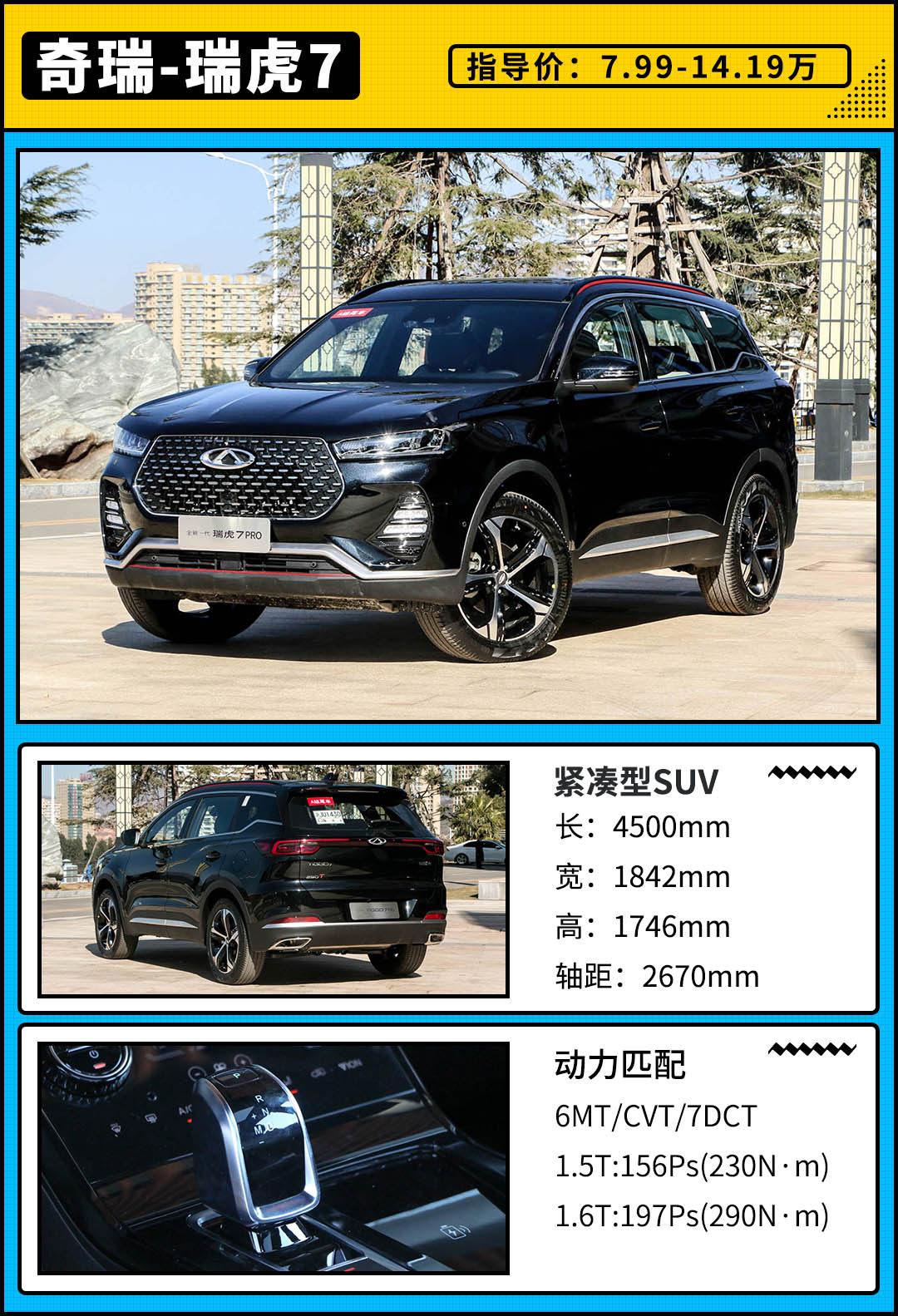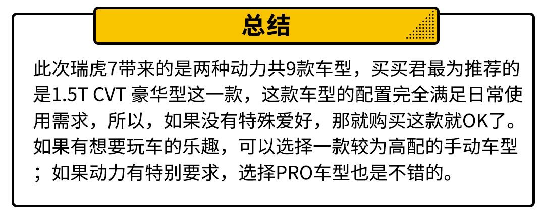 此次的瑞虎7带来了两种动力车型, 分别是瑞虎7和瑞虎7PRO。值得一提的是,PRO版本就是瑞虎7动力升级版,在外形上面几乎没有任何变化,所以,买买君就不把这两种车型分开讲了。全新瑞虎7提供1.5T+CVT/6MT、1.6T+7DCT三种动力总成共9款车型,售价格区间为7.99-14.19万元。全新的瑞虎7完全颠覆了老款的设计,以一种全新的面貌出现,如此“大动干戈”的瑞虎7是不是令你非常心动呢?那么,面对这9款车型,该选哪一款才好呢?买买君这就来和您说道说道。