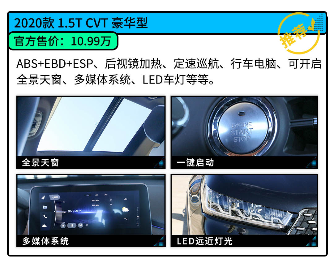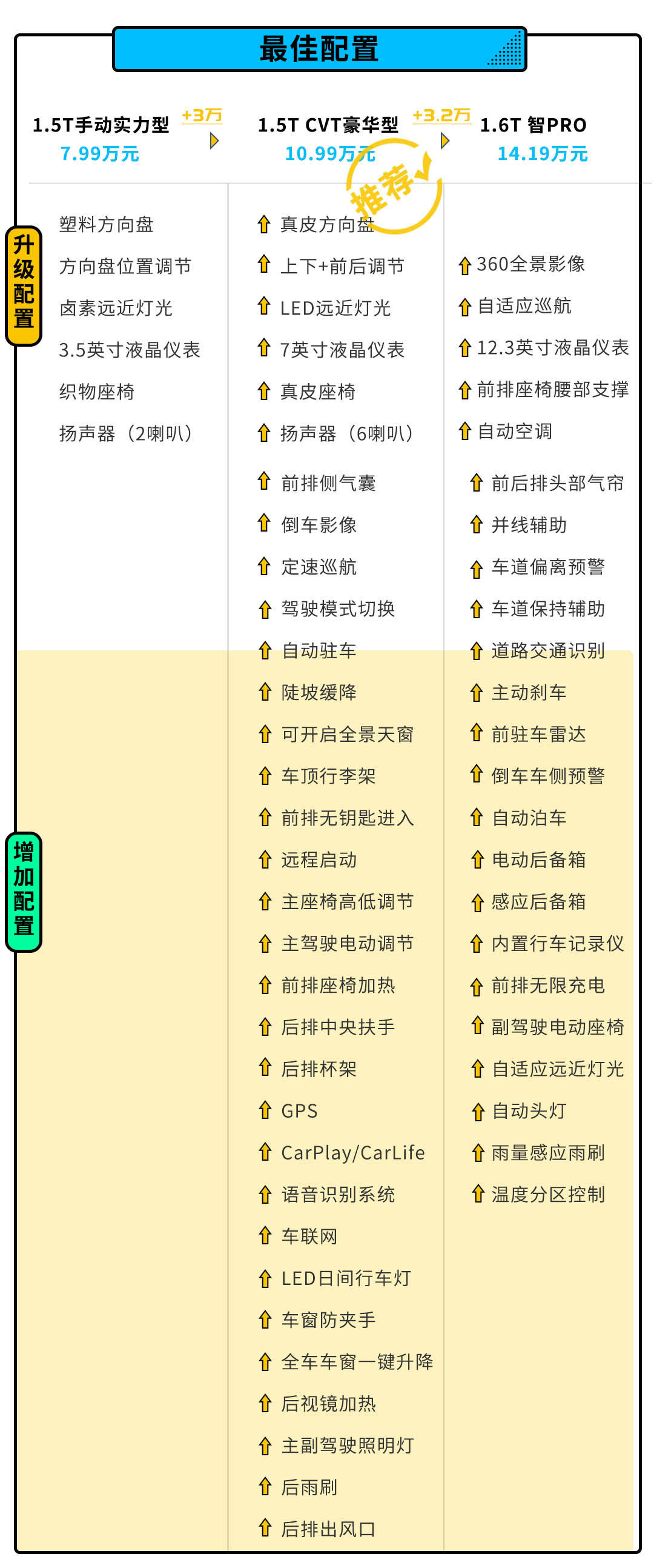 从标配和最佳配置来看,买买君更推荐购买1.5T CVT豪华型,毕竟都是家用车型,满足日常使用即可,而且价格也在一个比较容易接受的范围(10万元左右)。