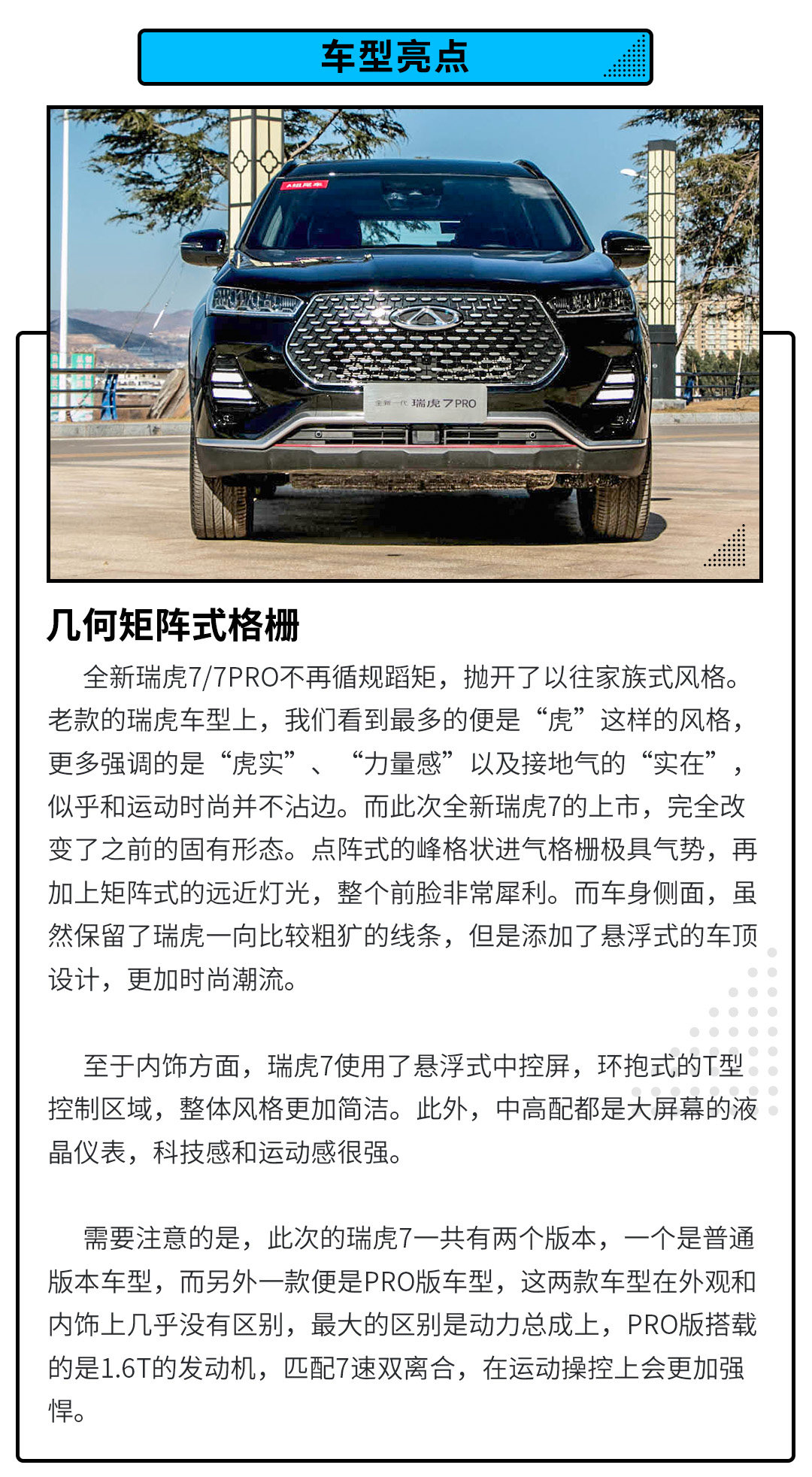 在前文买买君已经提到,此次全新的瑞虎7并没有按照家族化的设计进行优化,而是以全新的面目来面对咱们消费者,所以买买君称它为不一样的“瑞虎”。那么,它有哪些方面不一样呢?或者说亮点都在哪里呢?来看看吧!