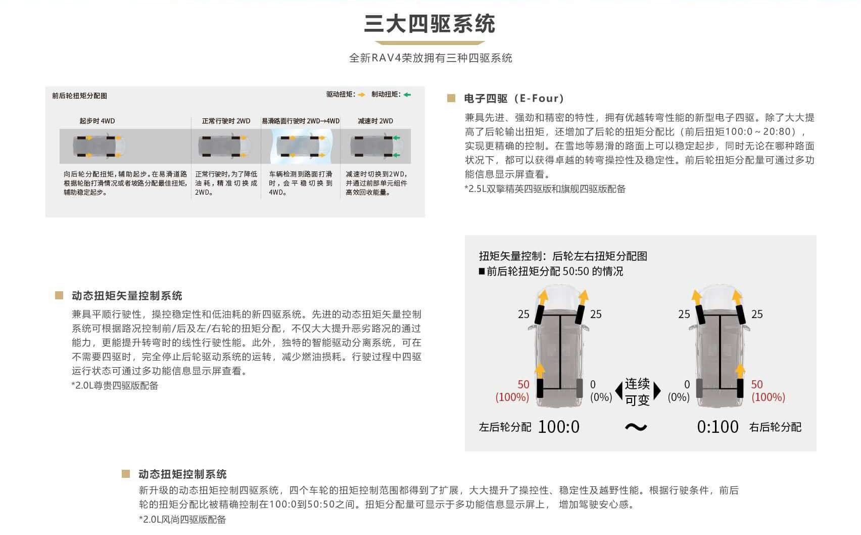 这一代的丰田RAV4荣放还是一款越野性能更好的城市SUV,全新的适时四驱系统配备了多地形控制功能,可以将最多50%的动力分配给后轮,电子限滑的能力得到提升,牵引力持续时间得到提升,在越野的时候更容易脱困。