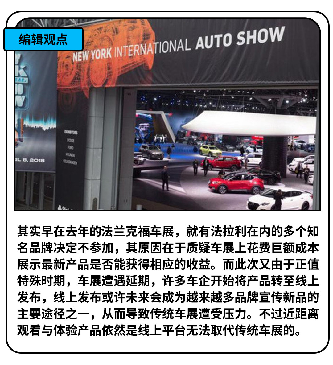 据CNBC报道,原定于4月8日开幕的纽约车展,因疫情原因推迟至8月26日至9月6日举办,其中媒体日为26~27日。纽约车展作为全球规模最大的车展之一,自1900年成立,除二战期间外,从未因其他原因取消或改期。这也是今年继日内瓦车展、北京车展、圣保罗车展后又一次受疫情影响的大规模汽车展会。