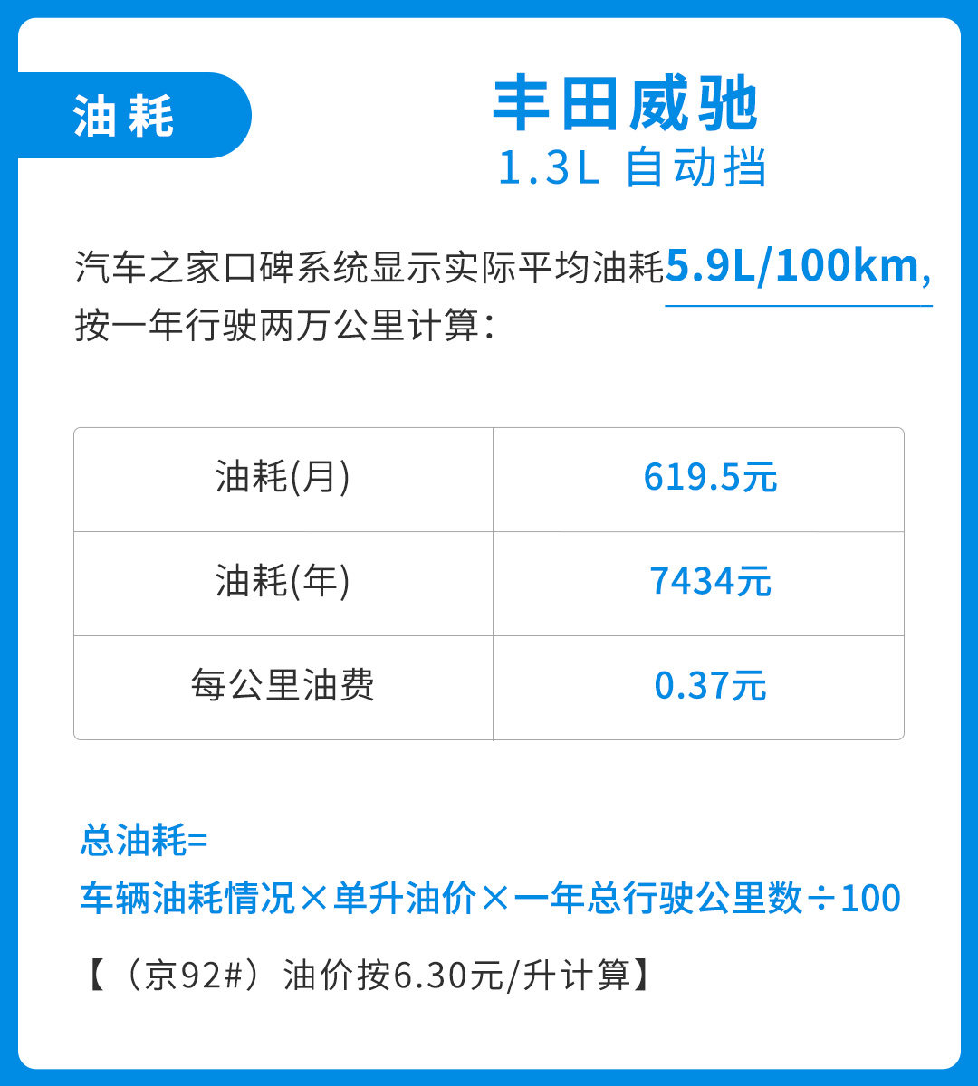 而从实际效果来看,威驰的油耗也印证了这点。根据汽车之家的车主油耗来看,威驰1.3L自动挡油耗为5.9L/100km,而1.5L自动挡油耗为6.4L/100km。如果折合成目前的油价来看,一公里仅需3.5~4毛钱,很大程度上节省了后期用车费用。
