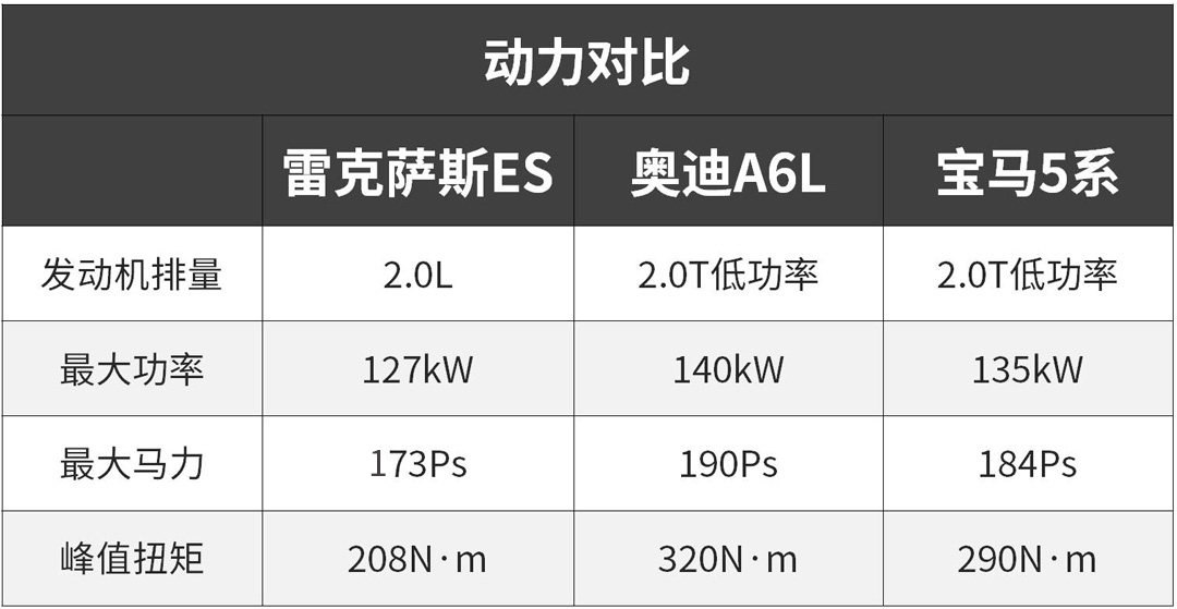 如果说单列出ES的数据不太明显,那么横向对比一下。相比于2.0L排量的低配奥迪A6L和宝马5系,采用了自然吸气方式的雷克萨斯ES在扭矩上劣势明显,而这也是对加速最为关键的数据。