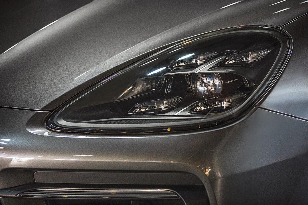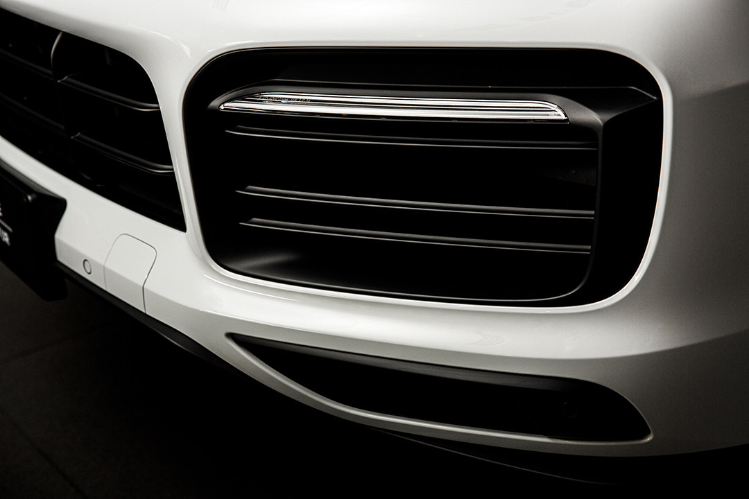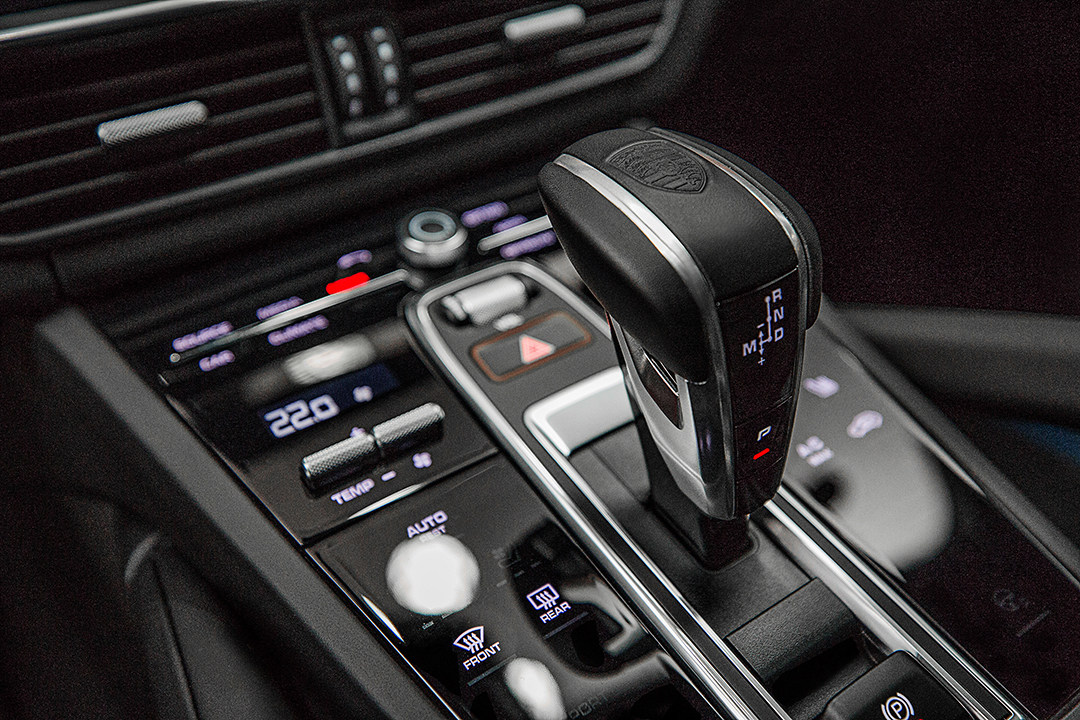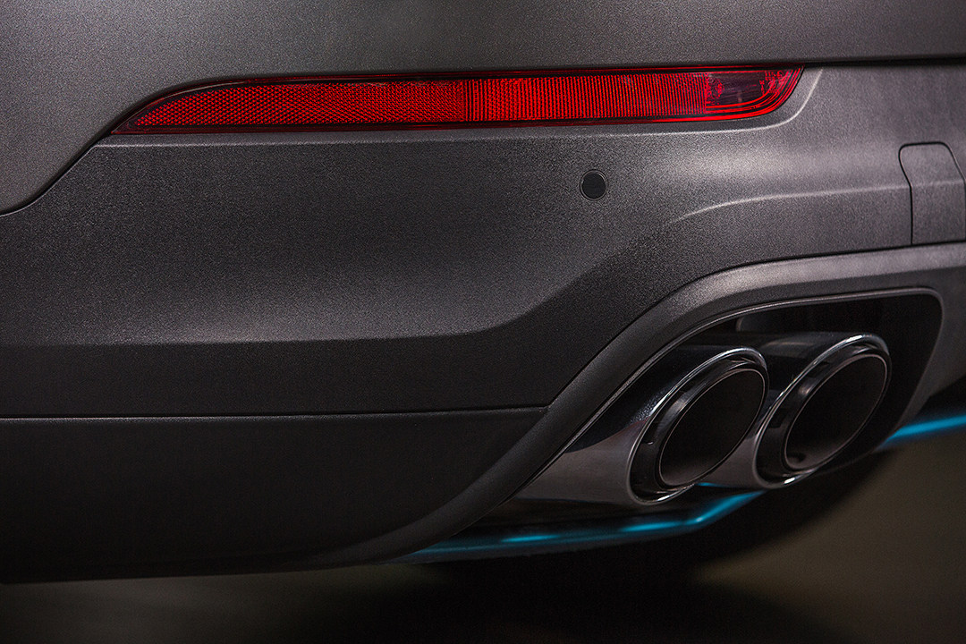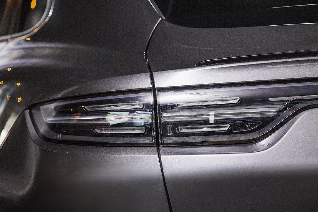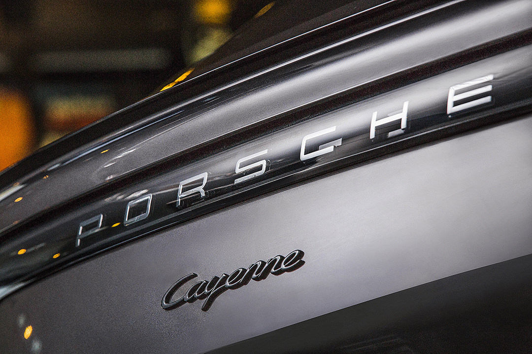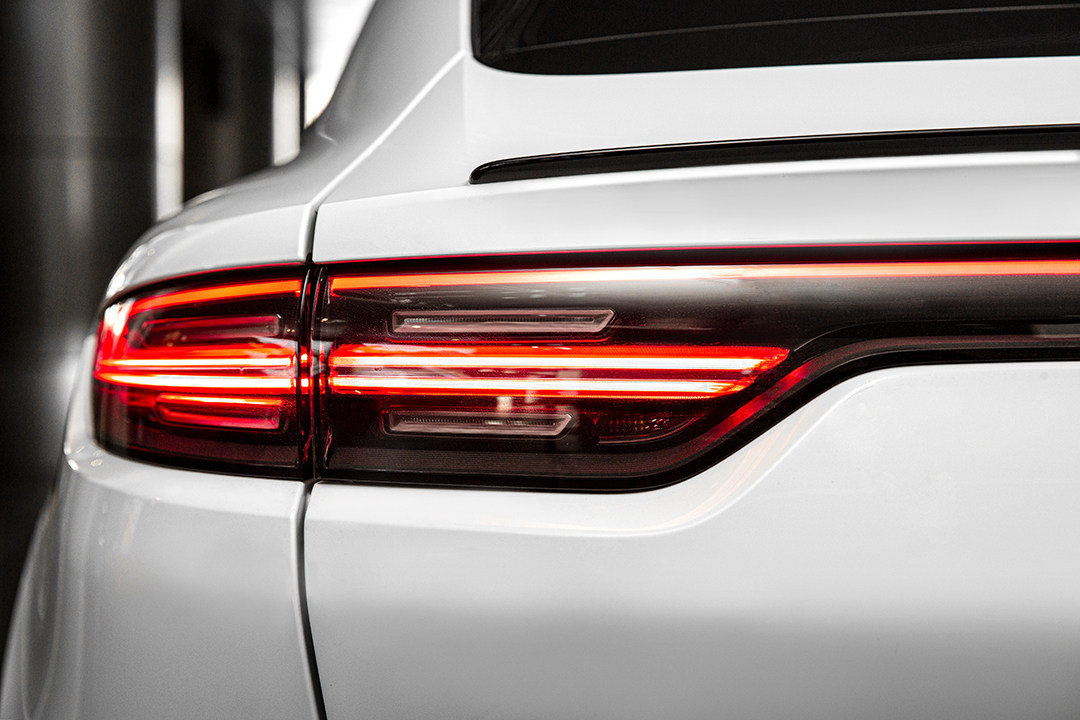 相同的部分我们简单略过:熏黑LED尾灯、车身同色的轮眉/后视镜罩、运动排气、银色带照明灯的门槛等等,营造出这辆卡宴Coupe独特的气场。