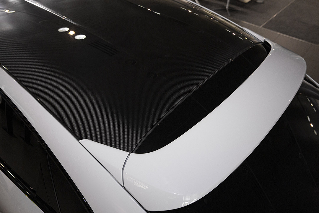 再到功能性层面,而这款车的重点在于轻量化和运动化的选装,整体而言选择了一个轻量化的运动套件,包括前面熏黑格栅和两侧的包围、侧面有下护板、尾部有扩散器、小尾翼、再到车顶采用了轻量化的配件。