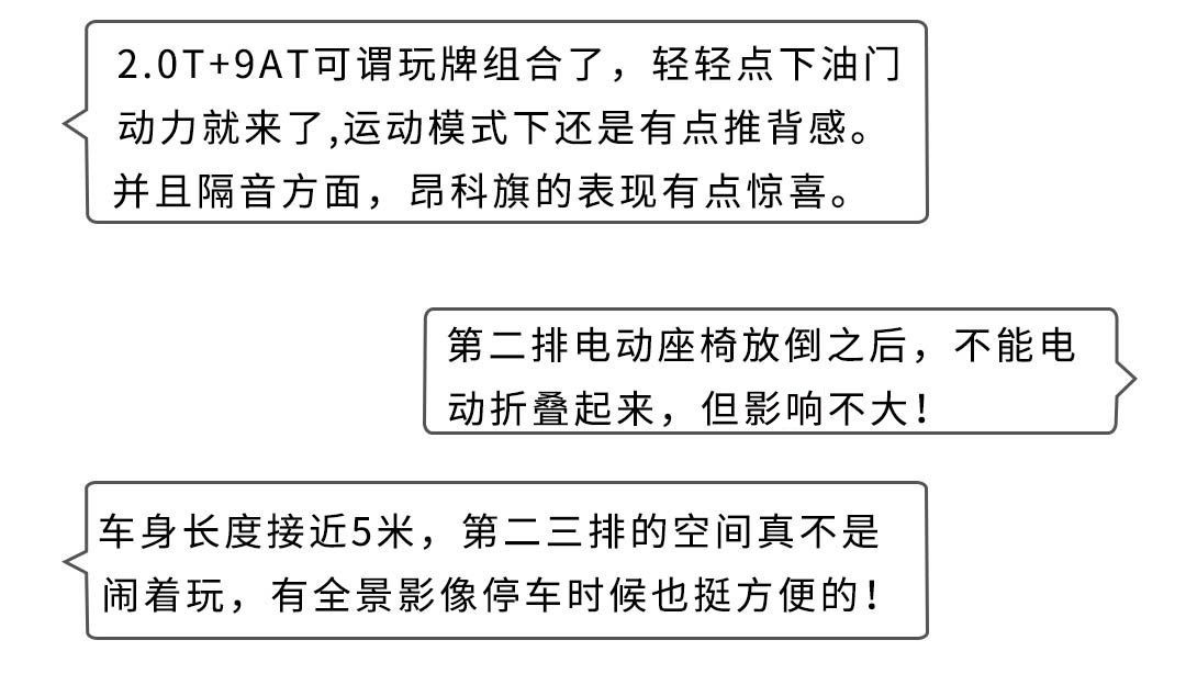 昂科旗作为7座SUV车型,接近5米的车身长度,空间性方面有胜处,细节上可以做得更好。比如在第二三排座椅的调节方式中,第二排座椅可以电动放倒,而第三排座椅更是可以电动放倒和折叠。再比如储物空间,全车储物空间大大小小多达40处。基于通用中大型豪华C1平台打造,有着2.0T+9AT的王牌动力组合,无论是三大件还是其它日常使用配置,别克昂科旗的实力可圈可点。