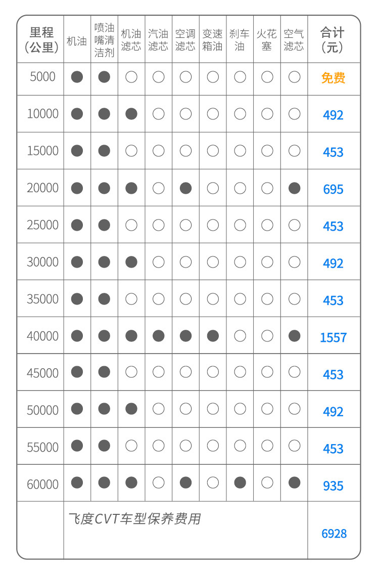 飞度的保养是比较麻烦的。首保免费,更换机油机滤。机油每隔5000公里换一次,而机滤每隔10000公里换一次。在每次更换机油的时候,飞度需要额外添加喷油嘴清洁剂,防止积碳差生,这就导致了保养费用稍微高一些。飞度6万公里的保养费用为6928元,比较贵。