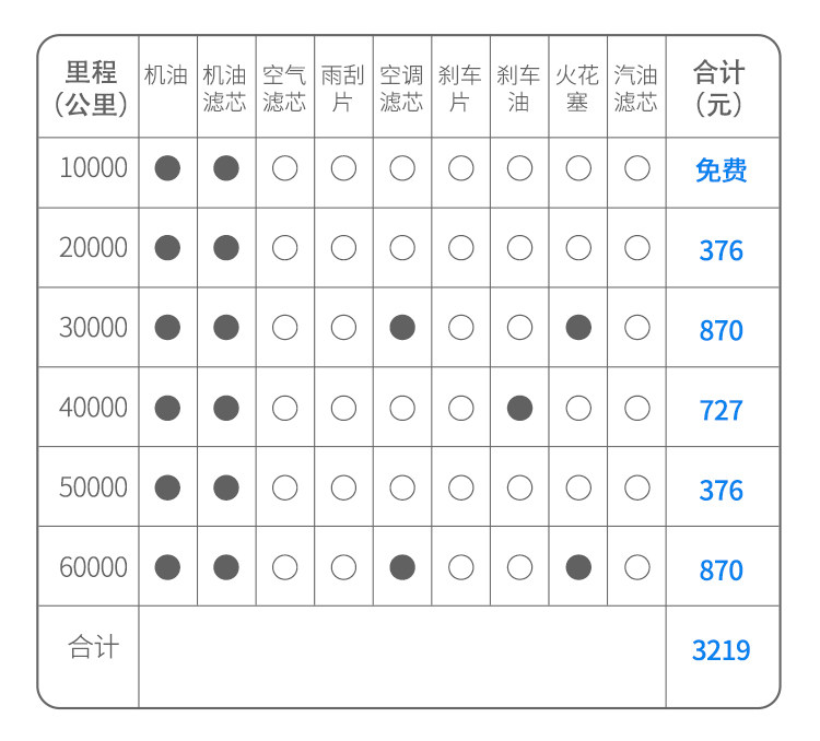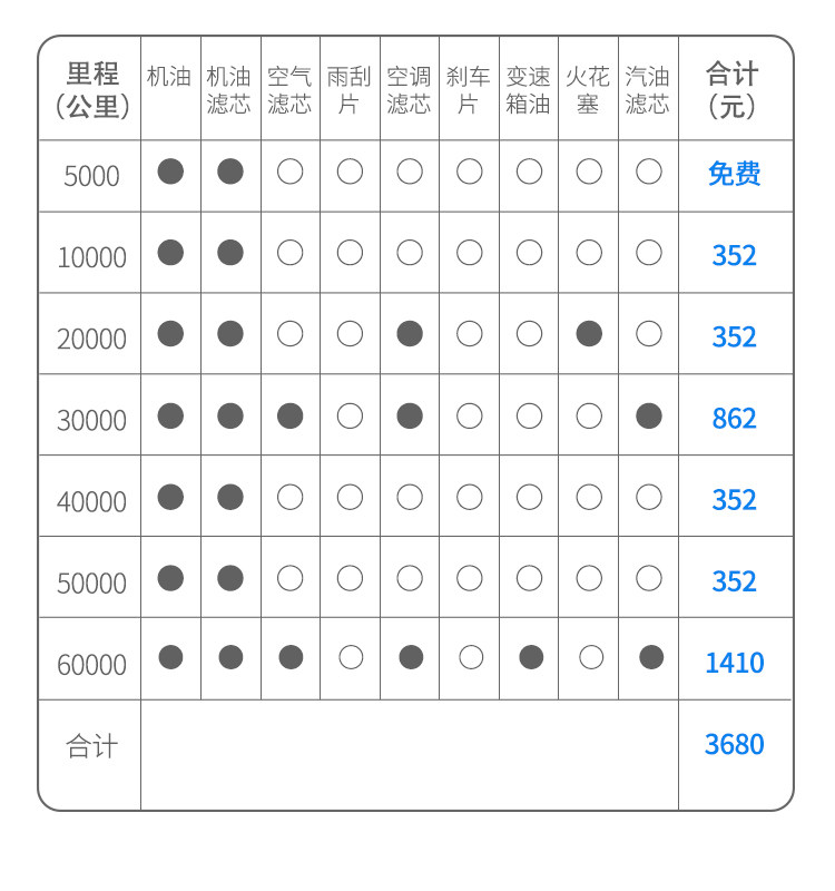 大众Polo的前两次保养是5000公里一次,往后就可以每10000公里保养一次。每1万公里更换机油机滤。每3万公里更换空气滤清器、空调滤清器、汽油滤清器和火花塞。每6万公里换一次,6万公里下来的保养费用是3680元。