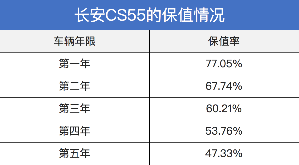 较高的保值率,是消费者认可的表现。根据某知名汽车网站,CS55的保值率比较喜人。车型在前三年的保值率分别为77.05%、67.74%、60.21%。在第三年的保值率上,CS55与竞争对手拉开了较大的差距,广汽传祺GS4已经跌到了50.63%,相当于3年过后车型只剩原车型的半价。